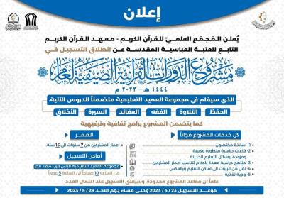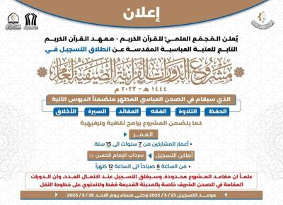 أعلن المجمع العلمي للقرآن الكريم في العتبة العباسية المقدسة عن إطلاق التسجيل للدورات القرآنية الصيفية بمحافظة كربلاء المقدسة.