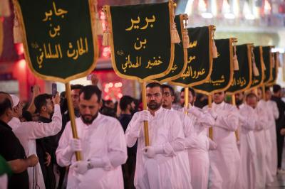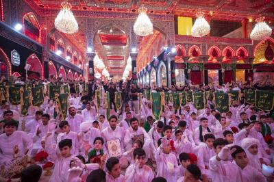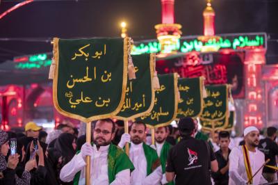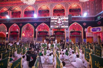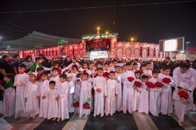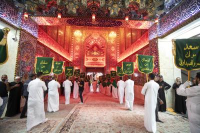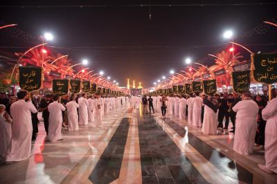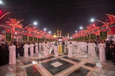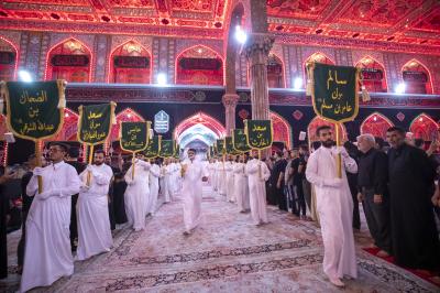 وانطلق الموكب الذي تميز خدمته بارتداء اللون الأبيض من أحد الشوارع المؤدية للعتبة العباسية المقدسة ومن ثم اتجه لدخول مرقد أبي الفضل العباس (عليه السلام) لتقديم العزاء له، ثم خرج الموكب باتجاه حرم أبي الأحرار الإمام الحسين (عليه السلام)، مرورا بساحة ما بين الحرمين الشريفين.