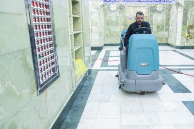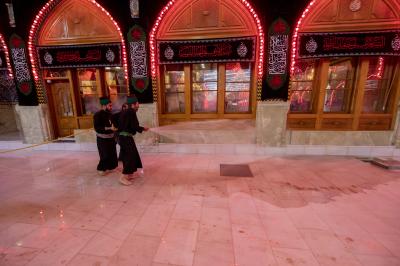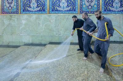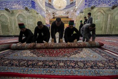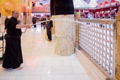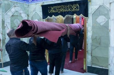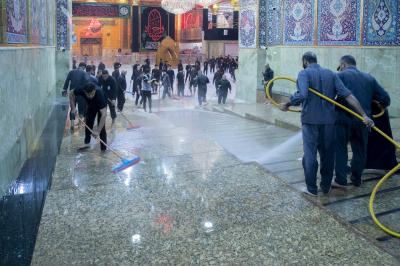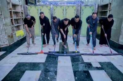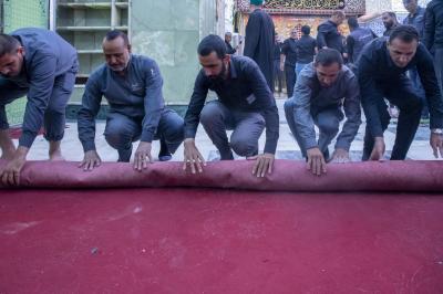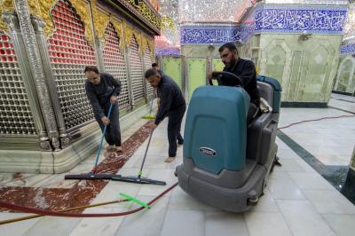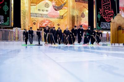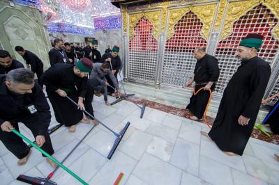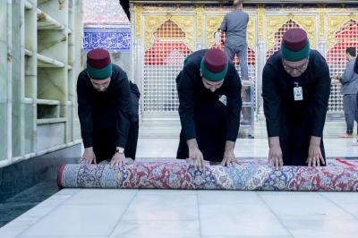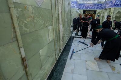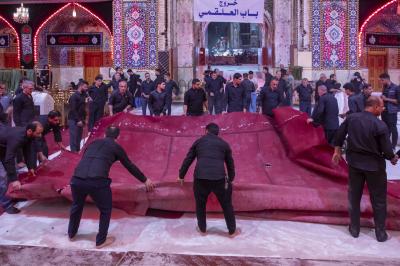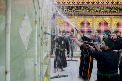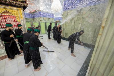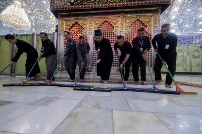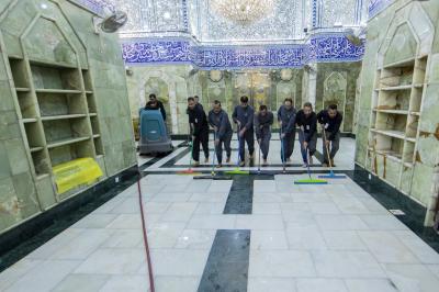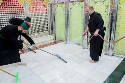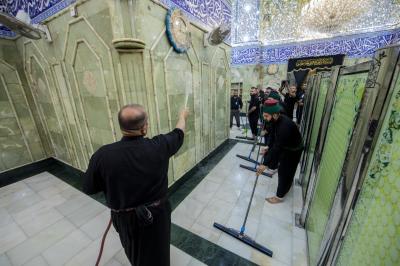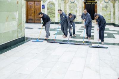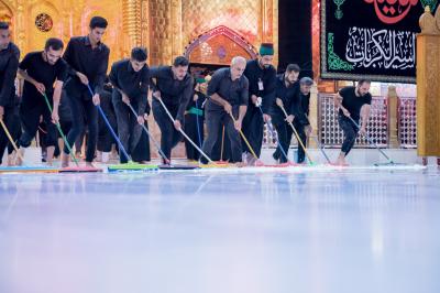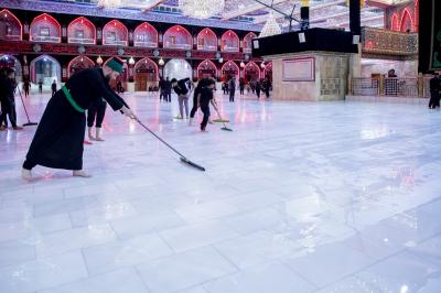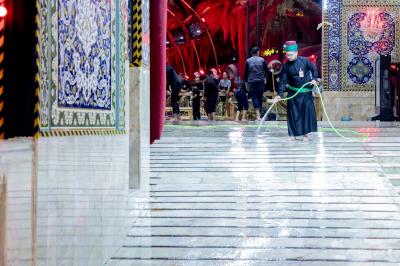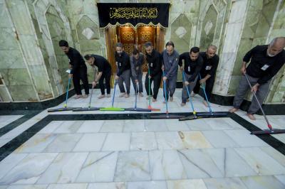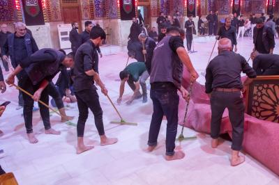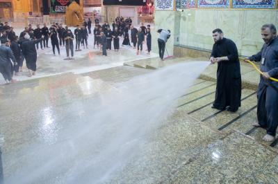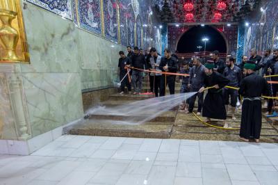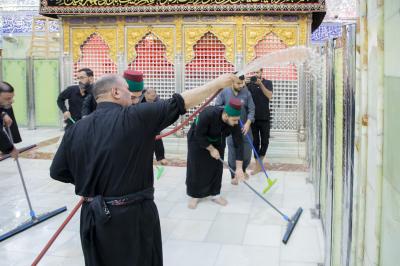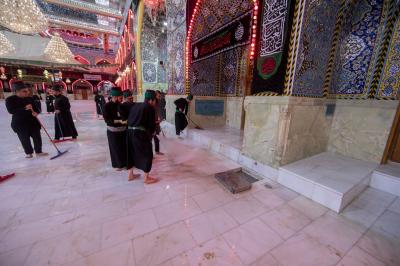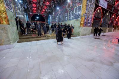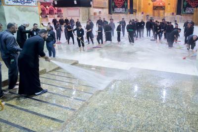 فيما أُجرِيت أعمال تنظيف الصحن الشريف وغسله، بعد رفع السجّاد الخاصّ بأيّام العزاء العاشورائي، بصورةٍ تتابعيّة حسب كلّ مقطع منه، بدءًا من الأروقة الخارجيّة للحرم الطاهر وختامًا ببوّابات العتبة المقدّسة.