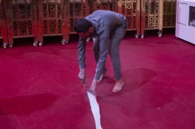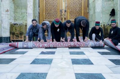 وتمّ تنظيف الأرضيّة والجدران وتعقيمها، وإزالة أيّ عوالق فيها قد تؤثّر على شكلها، باستخدام موادّ خاصّة جمعت بين التنظيف والتعقيم، ثمّ إعادة فرشه بالسجّاد المخصّص له.