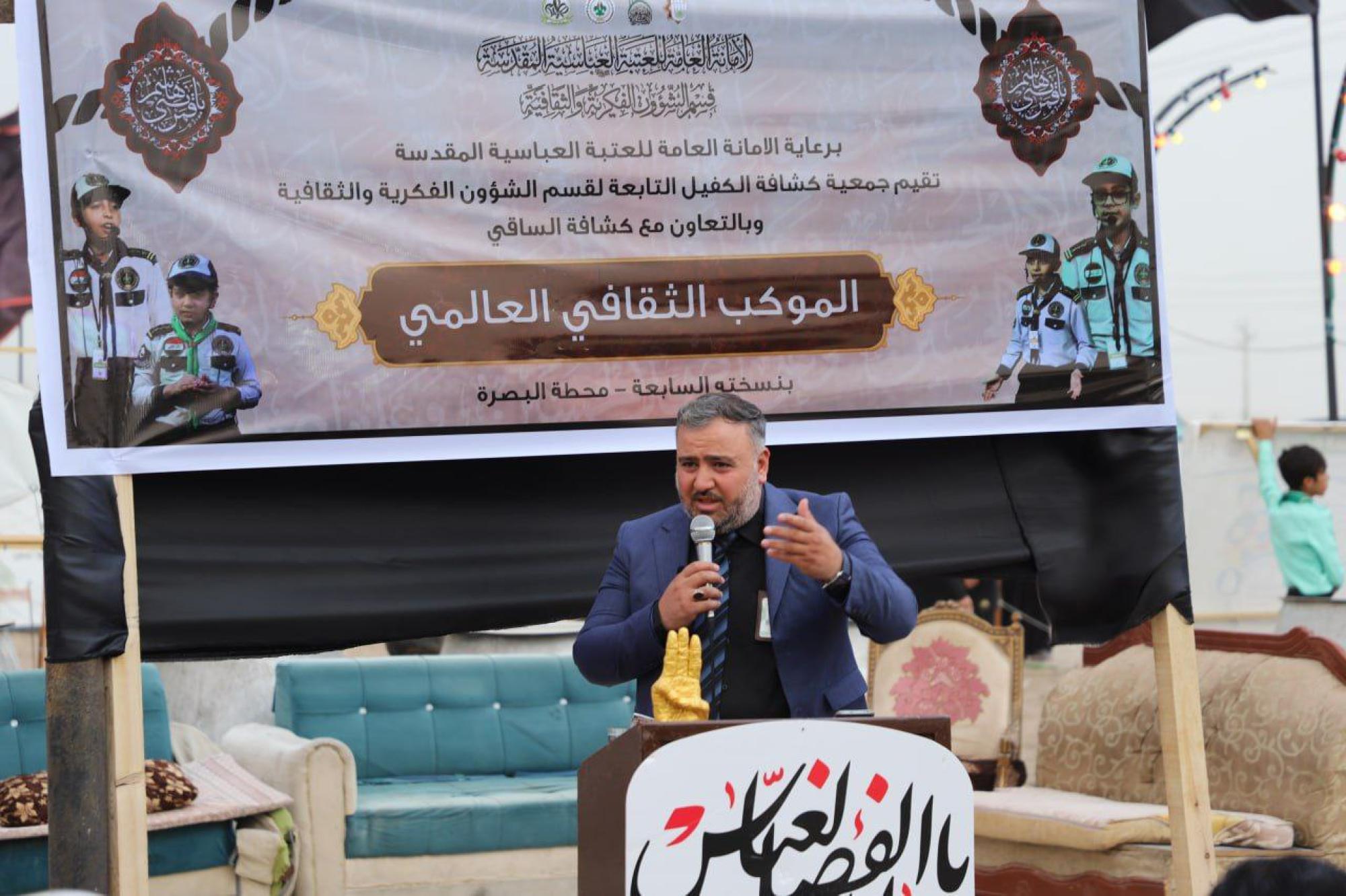 وشهد حفل الافتتاح الذي حضره وكيل المرجعية الدينية العليا في البصرة، إلى جانب عدد من الشخصيات الحوزوية والأكاديمية في المحافظة وجمع كبير من الزائرين، كلمة لجمعية كشافة الكفيل وكلمة كشافة الساقي، فضلاً عن استعراض نشيد حسينيّ والقيام بجولة لشرح مفاهيم الموكب الثقافي، "وفقًا" للكناني.