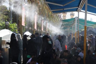 He pointed out that"spray fans deployed in the yard between the two shrines and inside the covered areas, which contribute to tempering the atmosphere, by (400) thousand liters of filtered water (RO) per day."