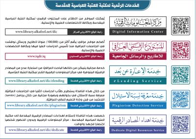 وقال مدير مركز المعلومات الرقمية التابع للمكتبة الأستاذ عمار الجواد، إنّه "لضمان استمرارية تقديم مصادر المعلومات الرقمية بمختلف أوعيتها المعرفية إلى الباحثين، اتجهت جهود المركز إلى تقديم مصادر المعلومات عبر المواقع الإلكترونية المُعدّة لهذا الغرض، وشملت هذه المواقع ثلاث خدمات رقمية، وهي (خدمة الإعارة عن بعد، وخدمة معرفة نسبة الاستلال، وخدمة إهداء المصادر عن بعد)".