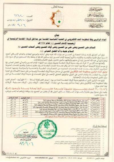 “Bu kapsamda elektronik sayım sisteminin belirttiğine göre; hicri 1445 yılı 1 Safer gününden 20 Safer günü saat 12:00’a dek toplam 22 milyon 19 bin 146 ziyaretçi; Bağdat – Kerbelâ, Necef- Kerbelâ, Babil-Kerbelâ, Huseynîye-Kerbelâ (her iki güzergah birden) ana girişlerinden mukaddes şehre giriş yapmıştır. Yüce Allah’tan hepsinin amellerini kabul buyurmasını ve hepsine sevdiği, razı olduğu işleri yapma başarısı vermesini niyaz ederiz. Kuşkusuz O pek işiten ve dualara icabet edendir!”