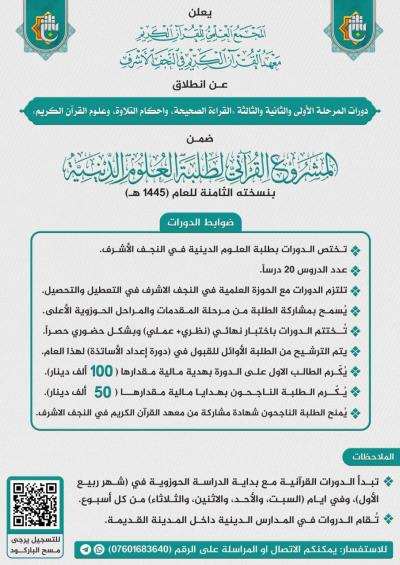 ويُشرف على الدورات معهد القرآن الكريم في النجف الأشرف التابع للمجمع، ضمن المشروع القرآني لطلبة العلوم الدينية بنسخته الثامنة للعام (1445 هـ).