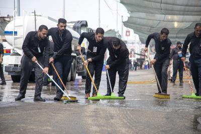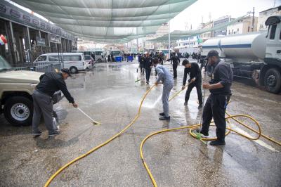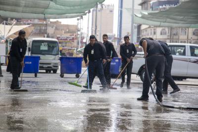 Wahudumu wa kitengo cha utumishi katika Atabatu Abbasiyya, wanaendelea kusafisha Barabara zinazoelekea kwenye haram takatifu, baada ya kumaliza ibada ya ziara ya Arubaini.