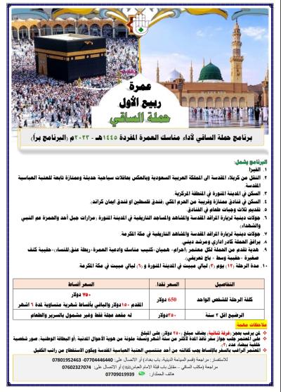 Msafara wa Saaqi wa ibada ya Umra hutoa huduma bora Zaidi za ziara na umra, hutumia basi za kisasa, zenye viyoyozi kutoka Karbala hadi Madina na Maka Kwenda na kurudi.
