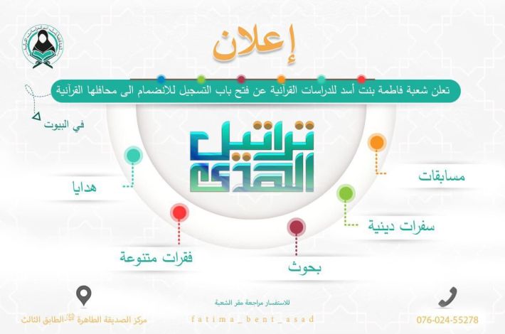 للراغبات بالتسجيل الحضور إلى مبنى الصديقة الطاهرة (عليها السلام) الطابق الثالث، مقر شعبة فاطمة بنت أسد للدراسات القرآنية يوم الاحد من كل أسبوع وآخر موعد للتسجيل نهاية شهر تشرين الثاني.