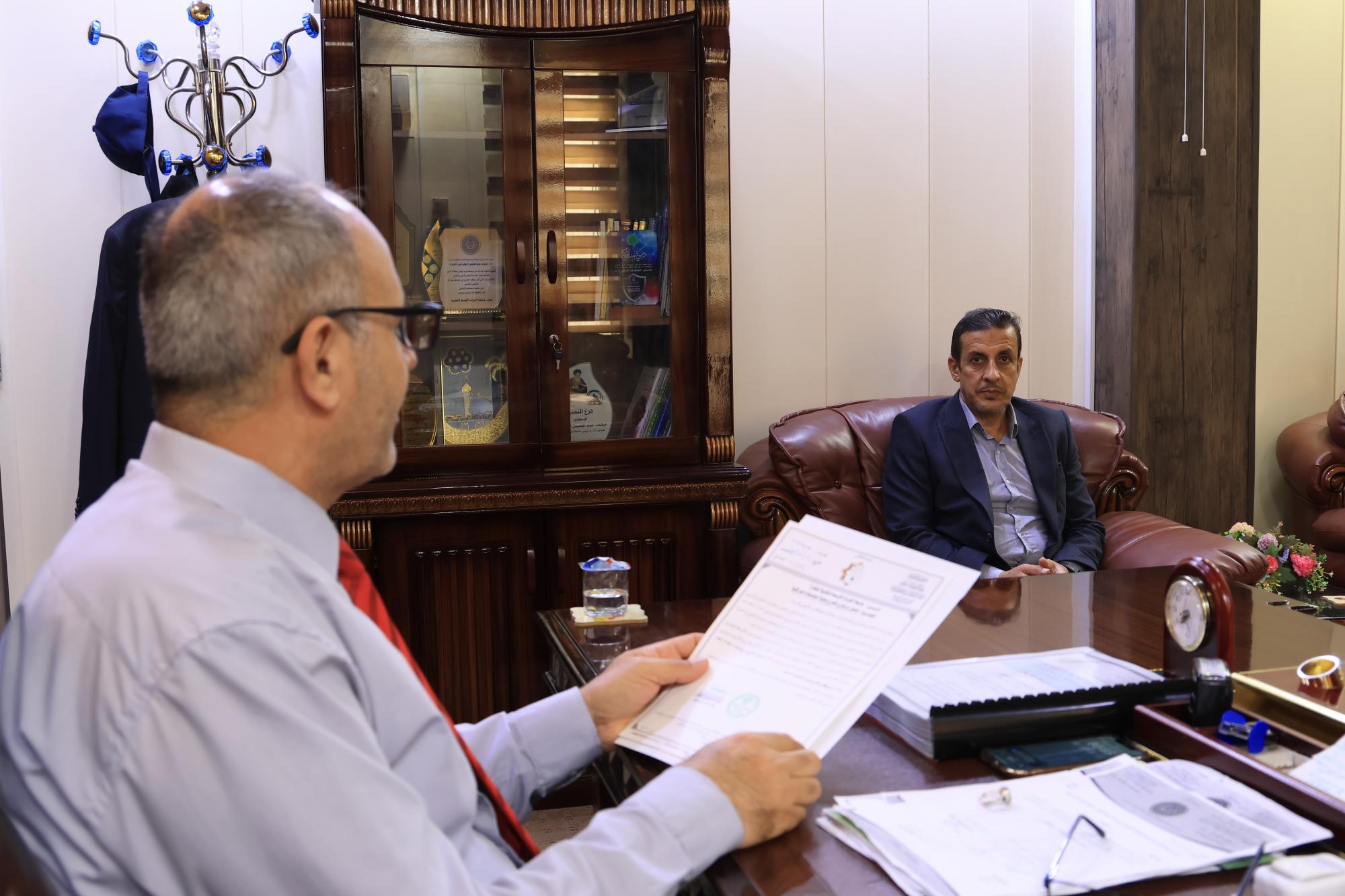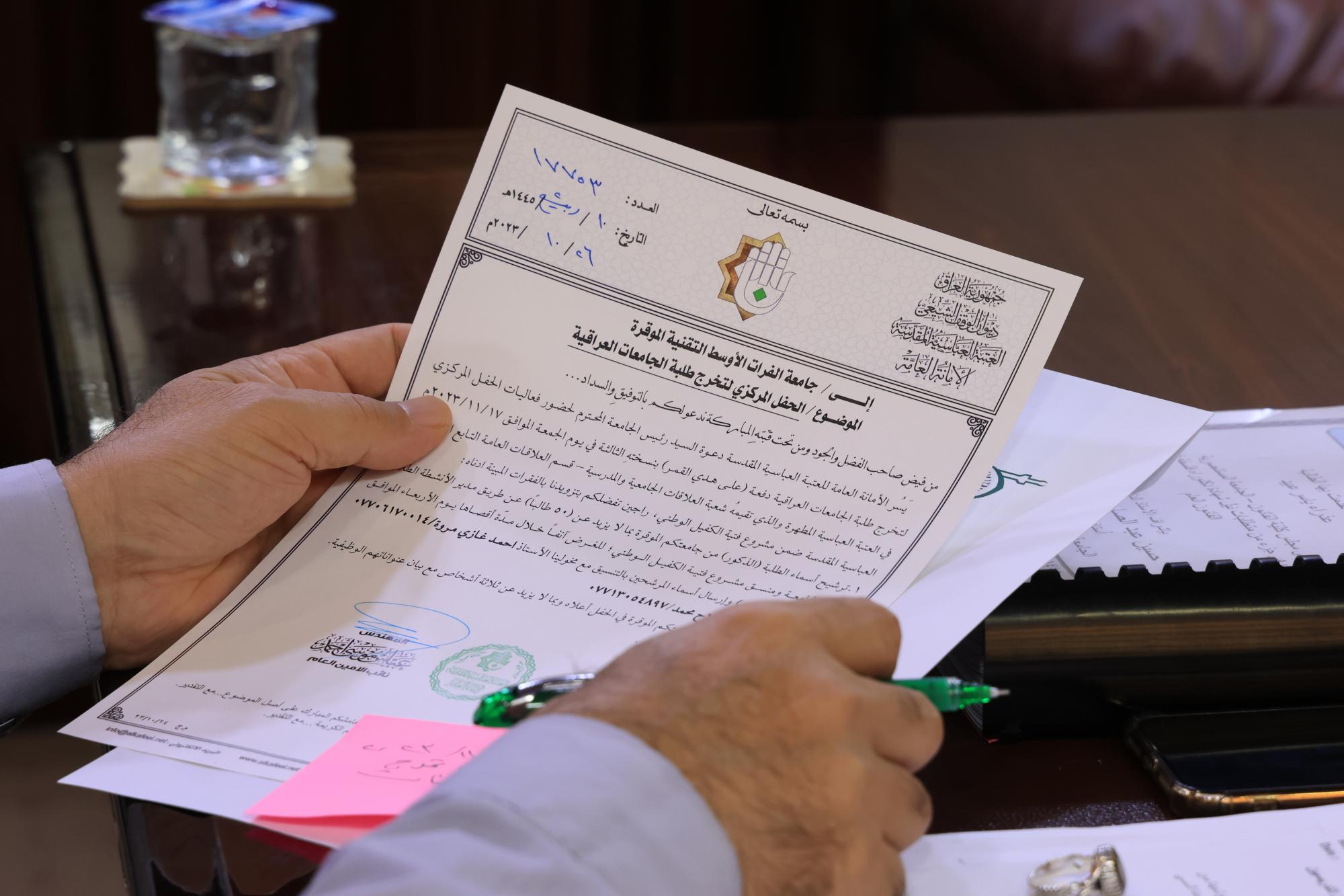 جاء ذلك خلال استقبال المساعد الإداري لرئيس الجامعة الأستاذ الدكتور محمد المجتومي وفد العتبة العباسية المقدسة، وتلقّيه دعوة للمشاركة في الحفل المركزي لتخرّج طلبة الجامعات العراقية، الذي يقيمه قسم العلاقات العامّة في العتبة المقدسة في اليوم السابع عشر من شهر تشرين الثاني الحالي.