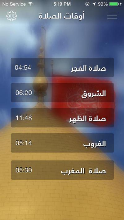 6- The timing of the prayers through the use of the phone's location (using latitude and longitude lines) that helps to know the prayer time even while travelling, with a choice in the Mu'adhens' voices from Karbala and beyond, with the possibility of prayer's schedule according to its geographical location;