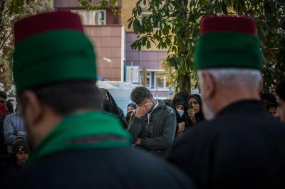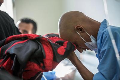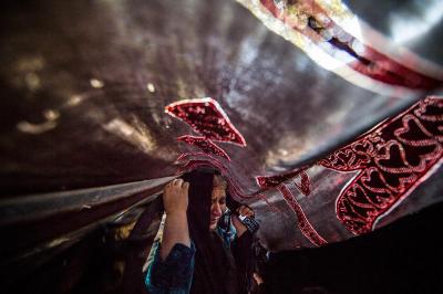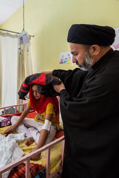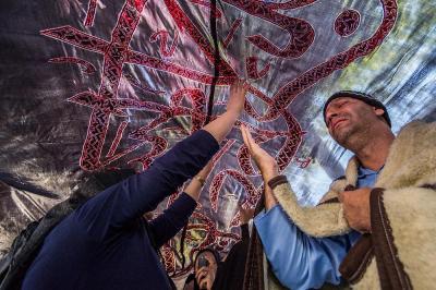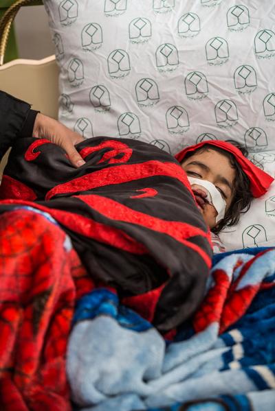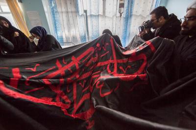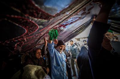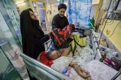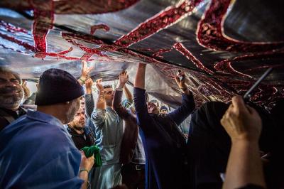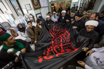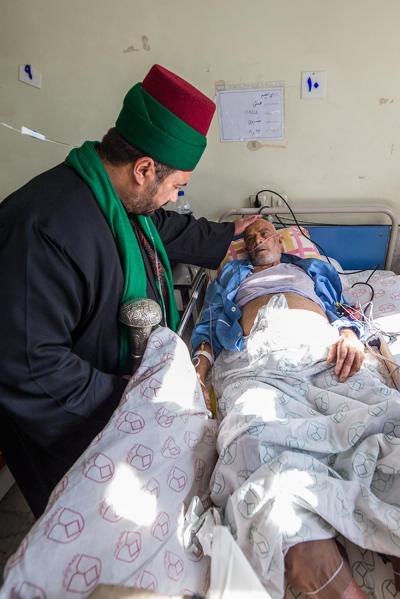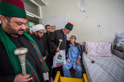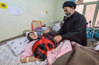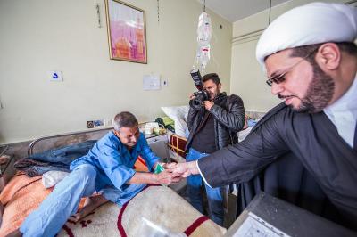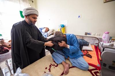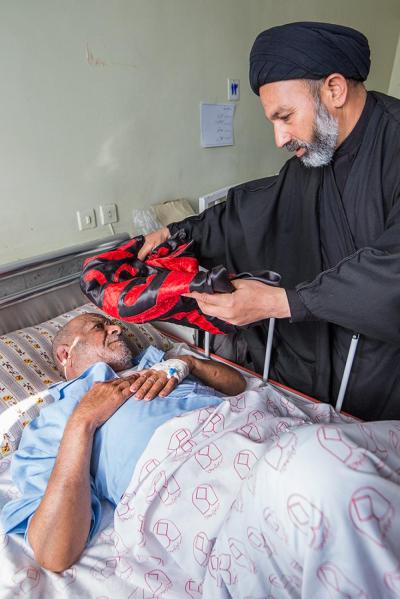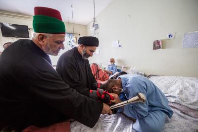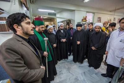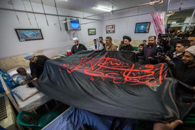 The servants of the Holy Shrine of Aba Al-Fadl Al-Abbas (peace be upon him) have paid a visit to the hospitals of Al-Ameen and Imam Ar-Reda (peace be upon him) specialized in the incurable diseases, holding in their hands the black banner of the holy shrine on which it was written "Ya Qamar Bani Hashem", moving from lounge to another, letting the patients with their tears feel in the presence of the one who is the door of the needs, Aba Al-Fadl Al-Abbas (peace be upon him), in very touching scene of deep love and loyalty even from those who are expecting death in any moment, invoking him: "O you who had uncovered the anguish from the face of your brother Al-Hussayn, uncover my anguish for the sake of your brother Al-Hussayn!"
