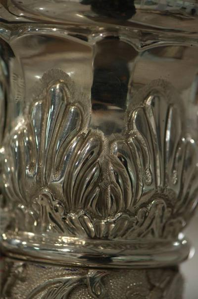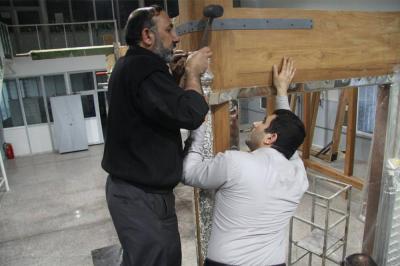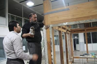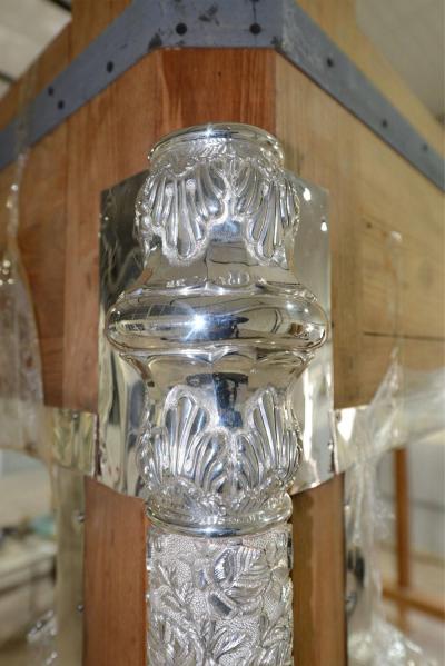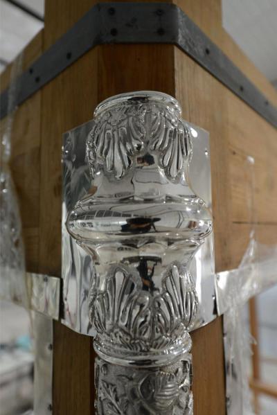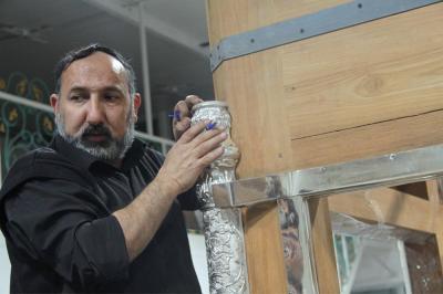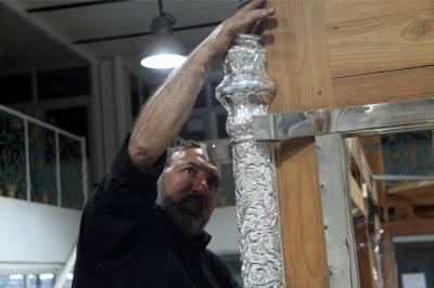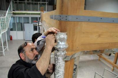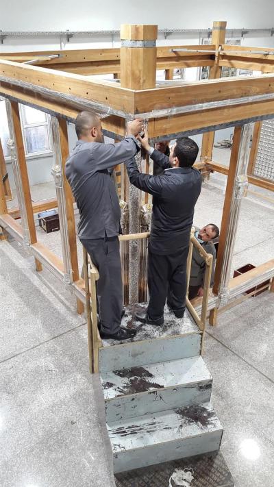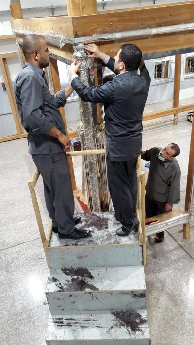 مسؤول مصنع شبابيك الأضرحة في العتبة العباسية المقدسة الصائغ رعد حسين الخفاجي بيّن لشبكة الكفيل: "بوتيرةٍ متصاعدةٍ وبهمّةٍ عاليةٍ ترافقها عملية التزامٍ حرفيّ بفقرات ومخططات التصاميم الخاصة بمشروع الشباك الجديد يتواصل العمل على إنجاز كافة فقرات ومفاصل الشباك الجديد، فبعد الانتهاء من تصنيع قطع تيجان الأعمدة الجانبية بوشر بتركيبها لتأخذ مكانها على السطح العلوي من العمود الركنيّ، وتعتبر من الأجزاء التكميلية والجمالية له، حيث أنّ كلّ عمودٍ يرتكز على سندانة فضية رُكّبت في وقتٍ سابق".