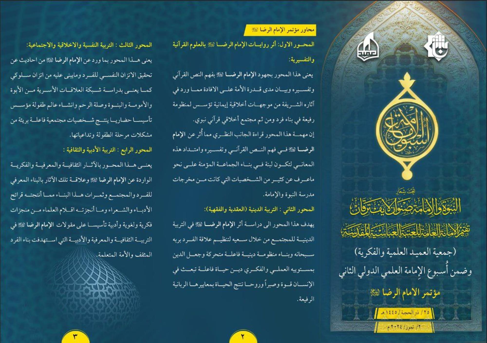 تدعو الأمانة العامة للعتبة العبّاسية الباحثين والمهتمّين من داخل العراق وخارجه، للمشاركة في مؤتمر الإمام الرضا(عليه السلام) ضمن فعّاليات أسبوع الإمامة العلميّ الدولي الثاني.