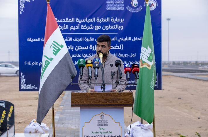 جاء ذلك عبر كلمة العوائل التي ألقاها ممثّلاً عنهم السيد مدين الشمري، خلال مراسيم افتتاح العتبة العباسية لمقبرة ضحايا البعث والتطرّف في النجف الأشرف.