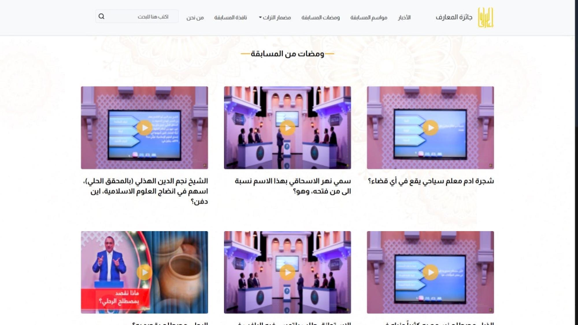 ويتضمن الموقع الموسوم (جائزة المعارف) ستة أبواب، الأول خاص بالأخبار، اما الباب شمل مواسم المسابقة ويضم جميع حلقات المواسم السابقة، بينما جاء بعنوان: (ومضات المسابقة) وفيه مجموعة من الفيديوهات القصيرة مأخوذة من الحلقات الرئيسة، بينما الباب الرابع وسم بمضمار التراث ويضم ثلاثة أجزاء من كتاب المضمار الذي يشتمل على جميع الأسئلة المطروحة في المسابقة بمواسمها الثلاثة، فيما حمل الباب الخامس عنوان نافذة المسابقة وفيه أدلة المسابقة ومكتبة للصور الفوتوغرافية، والباب السادس (حولَ) يشتمل على تعريف بالمسابقة مع بيان آليتها وجوائزها.