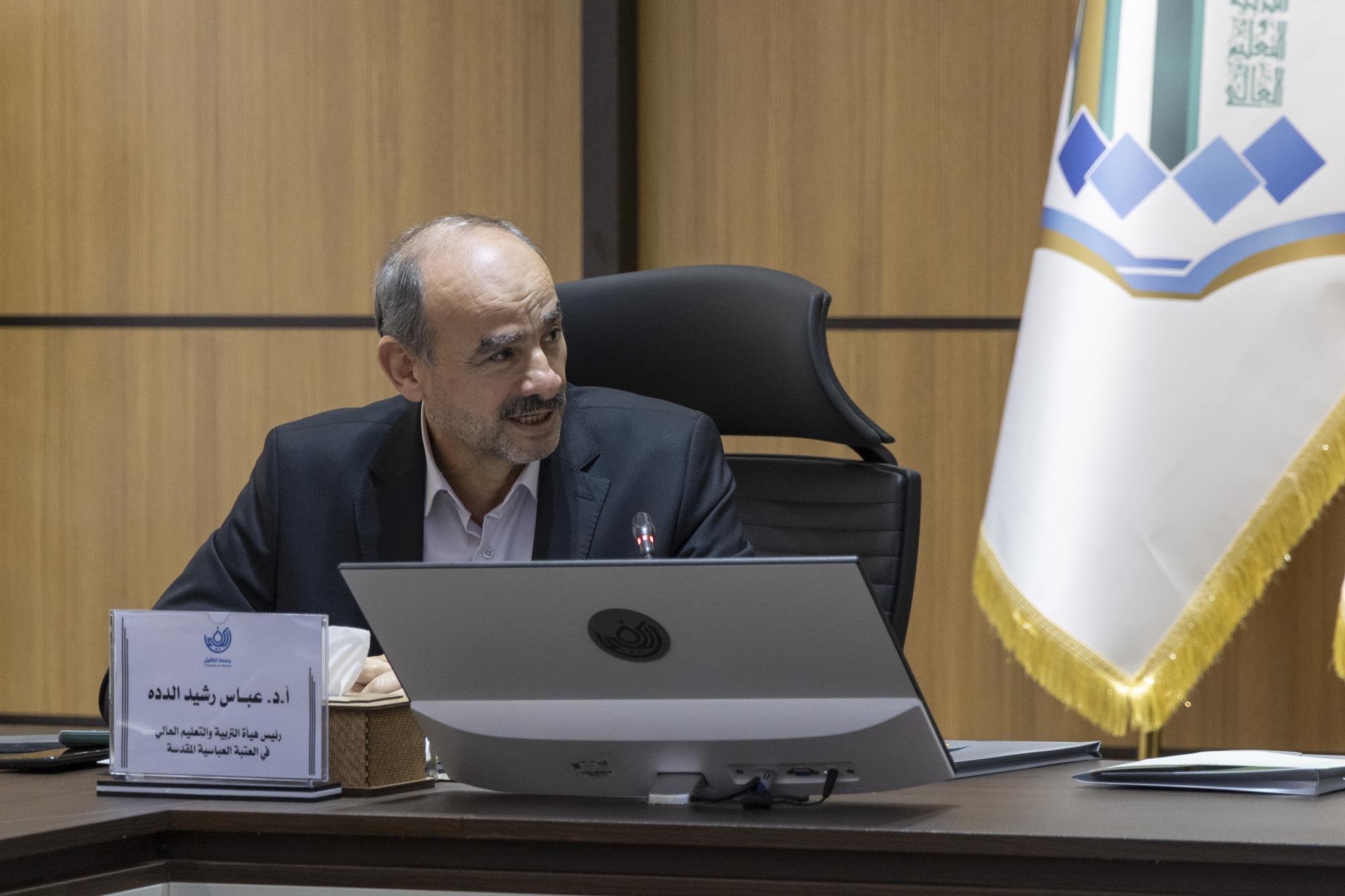 La session a été présidée par le président de l'université, le Dr Nawras Al-Dahan, en présence du chef de la Commission de l'éducation et de l'enseignement supérieur du sanctuaire sacré d'Al-Abbas et d'un membre de son conseil d'administration, le Dr Abbas Rashid Al-Dada Al-Moussawi, ainsi qu'un certain nombre de personnalités officielles et universitaires de la ville sainte de Najaf.