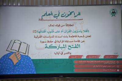 La responsable de la division, Mme Fatima Abbas Al-Moussawi, a déclaré : « La division a organisé le concours « Ceux qui sont fermement enracinés dans la connaissance" pour mémoriser la sourate bénie Al-Fath, ainsi que les significations, les concepts, les enseignements et les aspects moraux qu'elle contient."