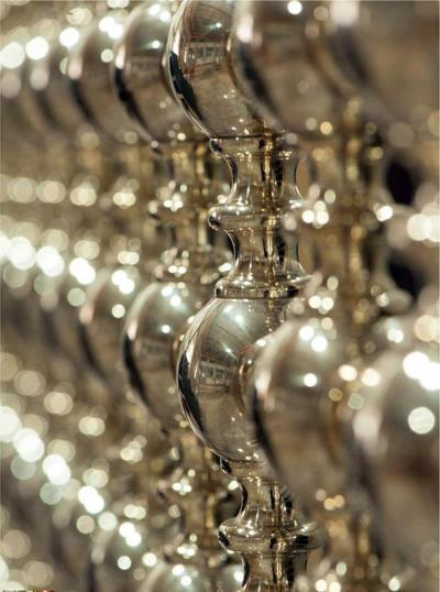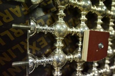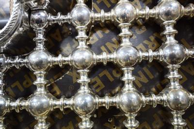 وتمتاز كلٌّ من الكرات الفضية ومقابضها بميزات حالُها حال بقية أجزاء الشبّاك الأخرى، ومن هذه الميزات إضافةً لكونها مصنوعة من الفضة النقية (999) والمخلوطة مع الذهب الخالص بنسبة (2%) فإنّ سُمْكها أكثر من سُمْك الكرات والمقابض القديمة، حيث يبلغ سُمْك الكرة الواحدة (3ملم) بينما كان سُمْك الكرات السابقة هو ملم واحد فقط، أما سُمْك المقابض والبالغ عددها (6,500) مقبض فيبلغ سُمْكها (6ملم) للمقبض الواحد والسابقة هو فقط ملم واحد أيضاً، وتأتي هذه الزيادة لتتناسب مع أوزان وأحجام باقي قطع الشباك الأخرى، وكذلك تمّت صناعتها بطريقةٍ حرفيةٍ جعلت منها شكلاً متناسقاً غاية في الجمال.