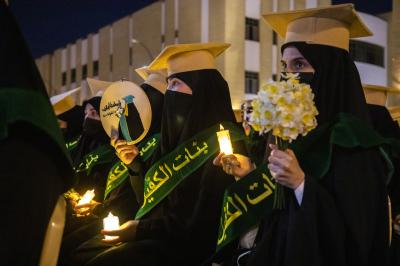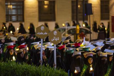 Les étudiantes irakiennes participant à la cérémonie sont entrées sur la place de célébration du groupe éducatif Al-Ameed, portant des bougies lumineuses en commémoration des martyrs de Gharra.