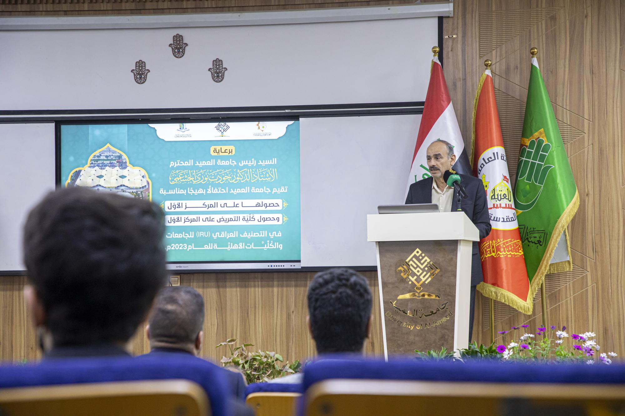 جاء ذلك في كلمته، خلال الاحتفاء بحصول جامعة العميد وكلية التمريض فيها على المركز الأول ضمن التصنيف العراقي (IRu) للجامعات والكليات الأهلية لعام 2023م.