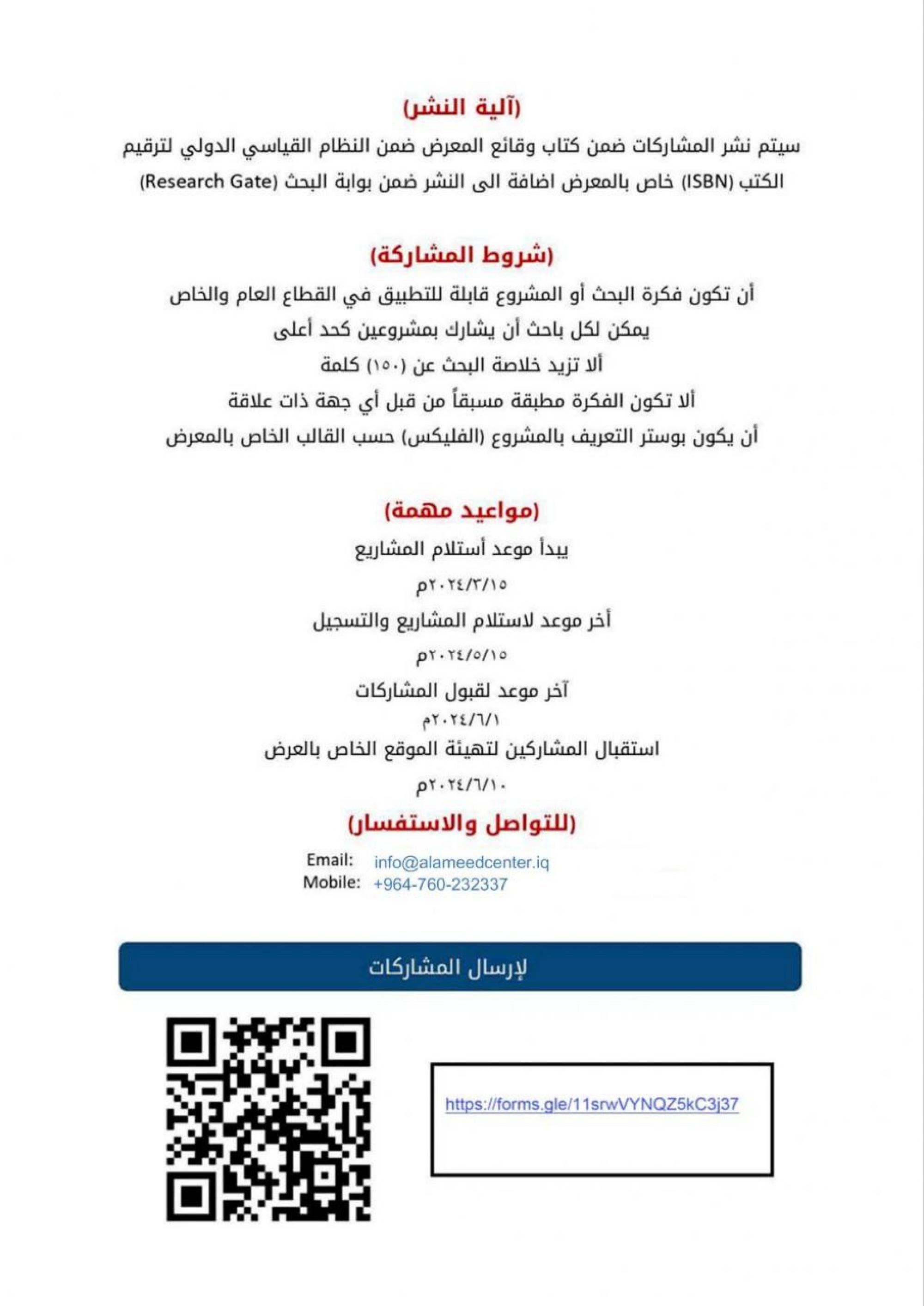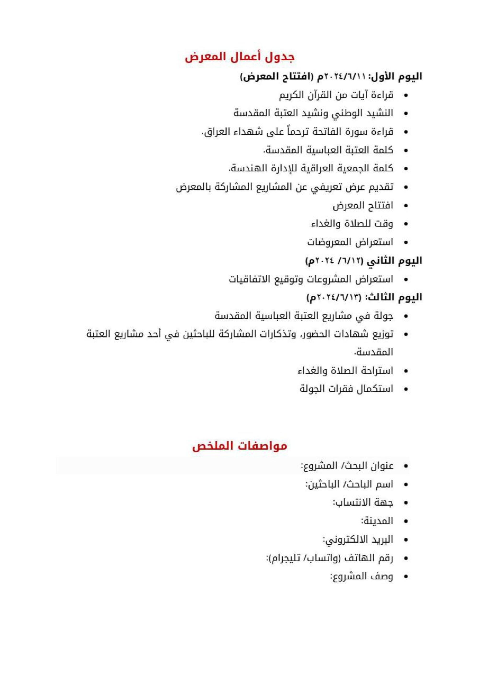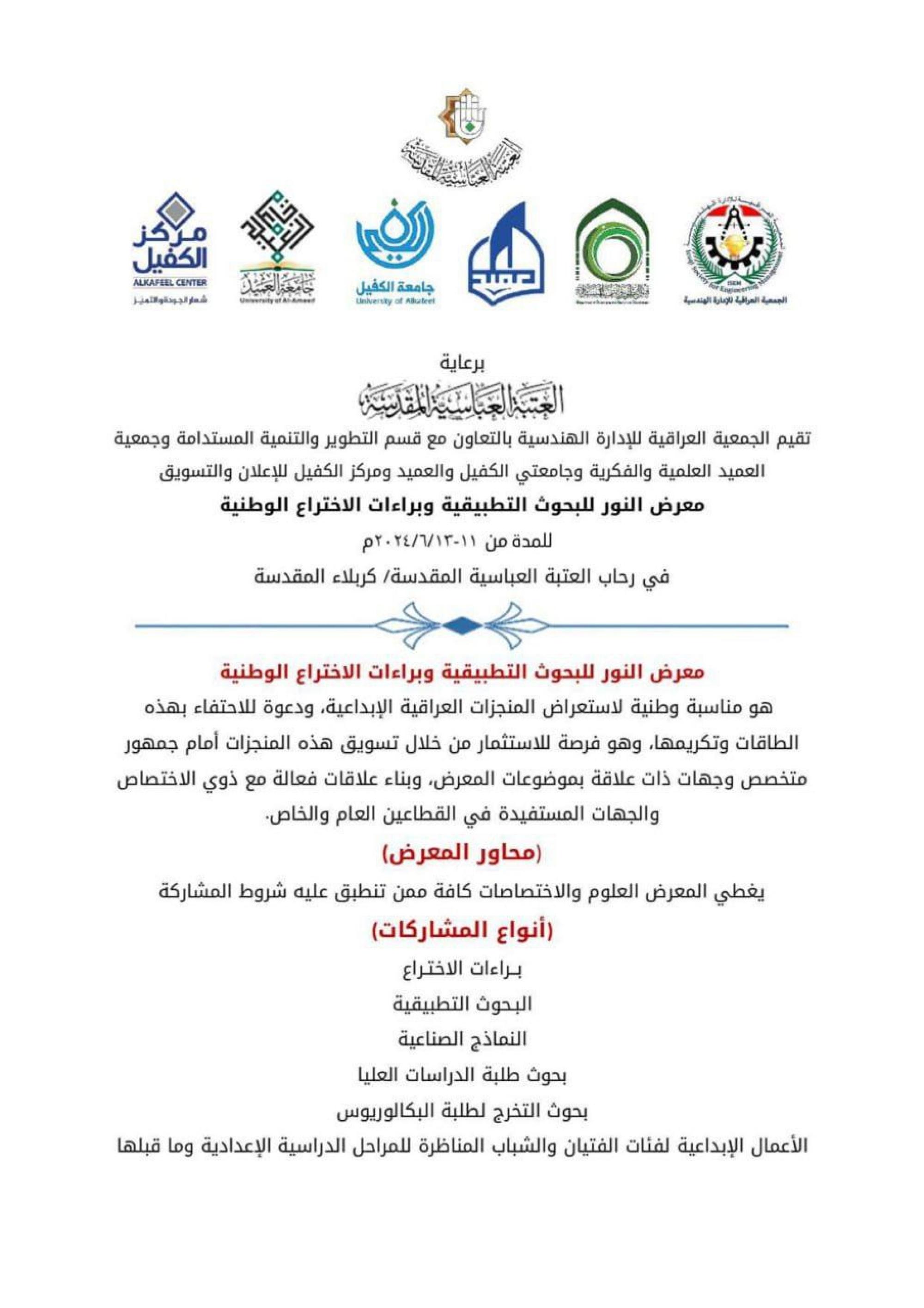 وتنظّم المعرض الجمعية العراقية للإدارة الهندسية بالتعاون مع قسم التطوير والتنمية المستدامة، وجمعية العميد العلمية والفكرية وجامعتي الكفيل والعميد ومركز الكفيل للإعلان والتسويق، للمدّة من (11 - 13/ 6/ 2024م)، ويهدف إلى استعراض الإبداعات والابتكارات العراقية في مختلف المجالات العلمية والتكنولوجية.