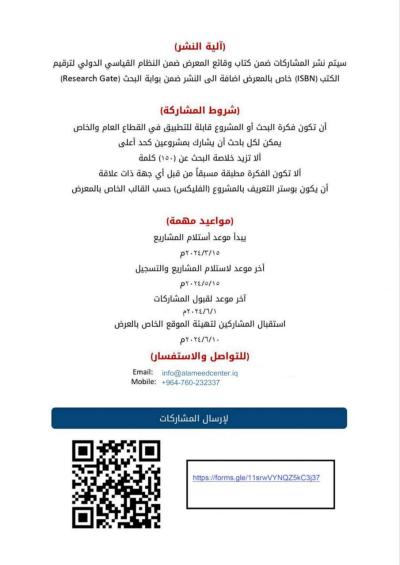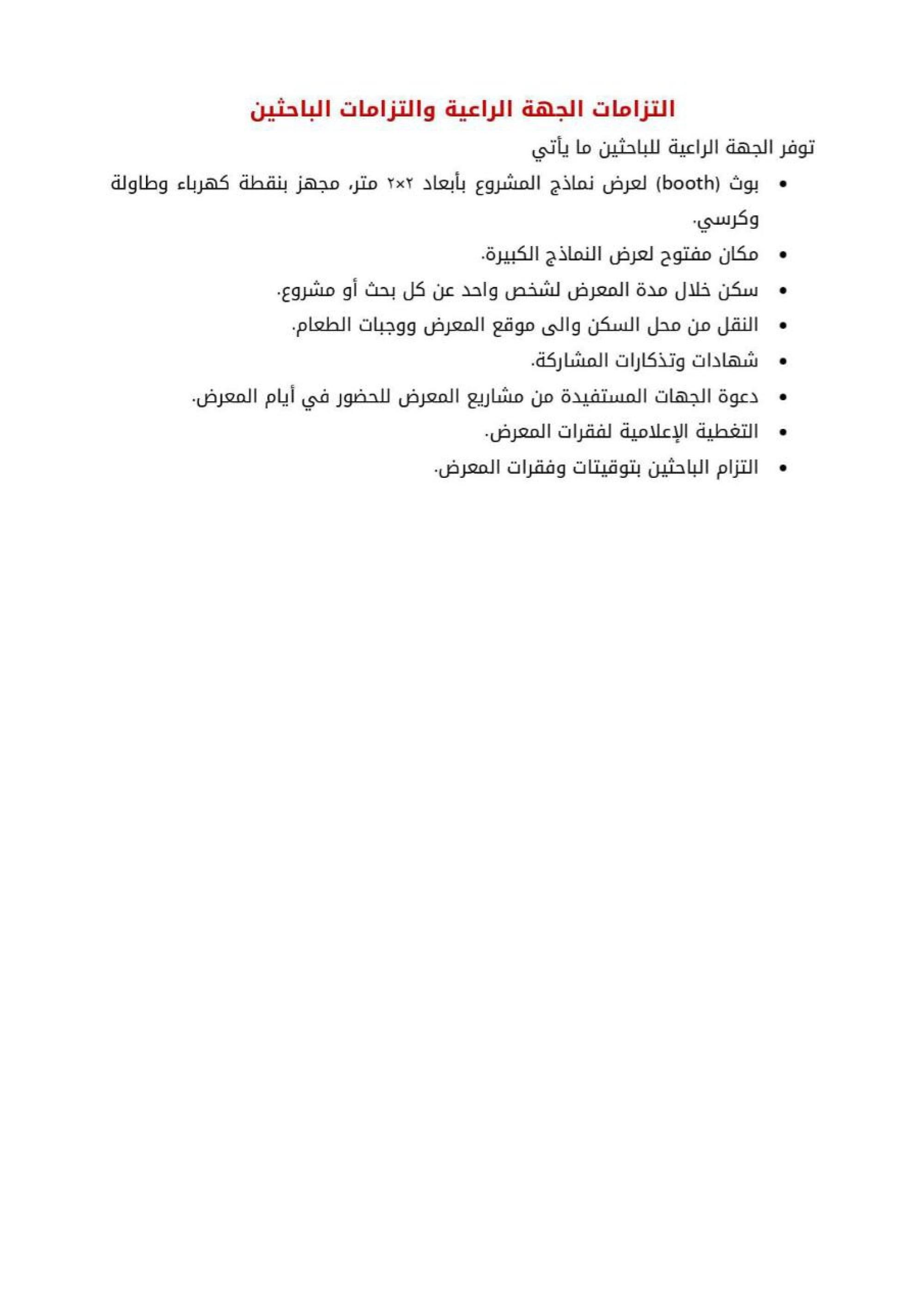 للاستفسار عن: (جدول أعمال المعرض، مواصفات الملخّص، التزام الجهة الراعية والتزام الباحثين، قالب البوستر التعريفي بالمشروع (الفليكس)، لإرسال المشاركات)، عبر الرابط أدناه: