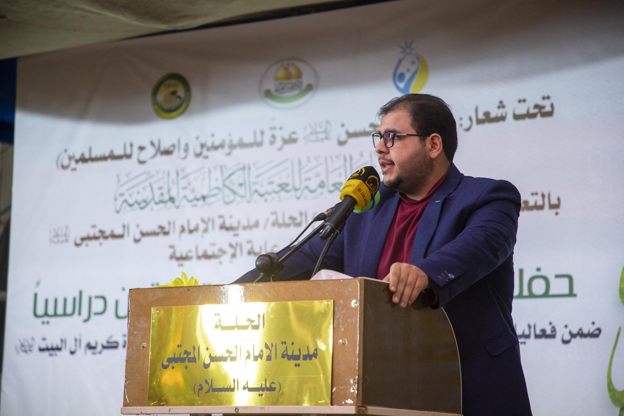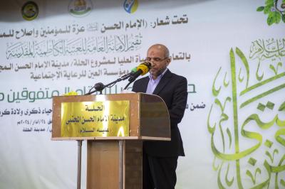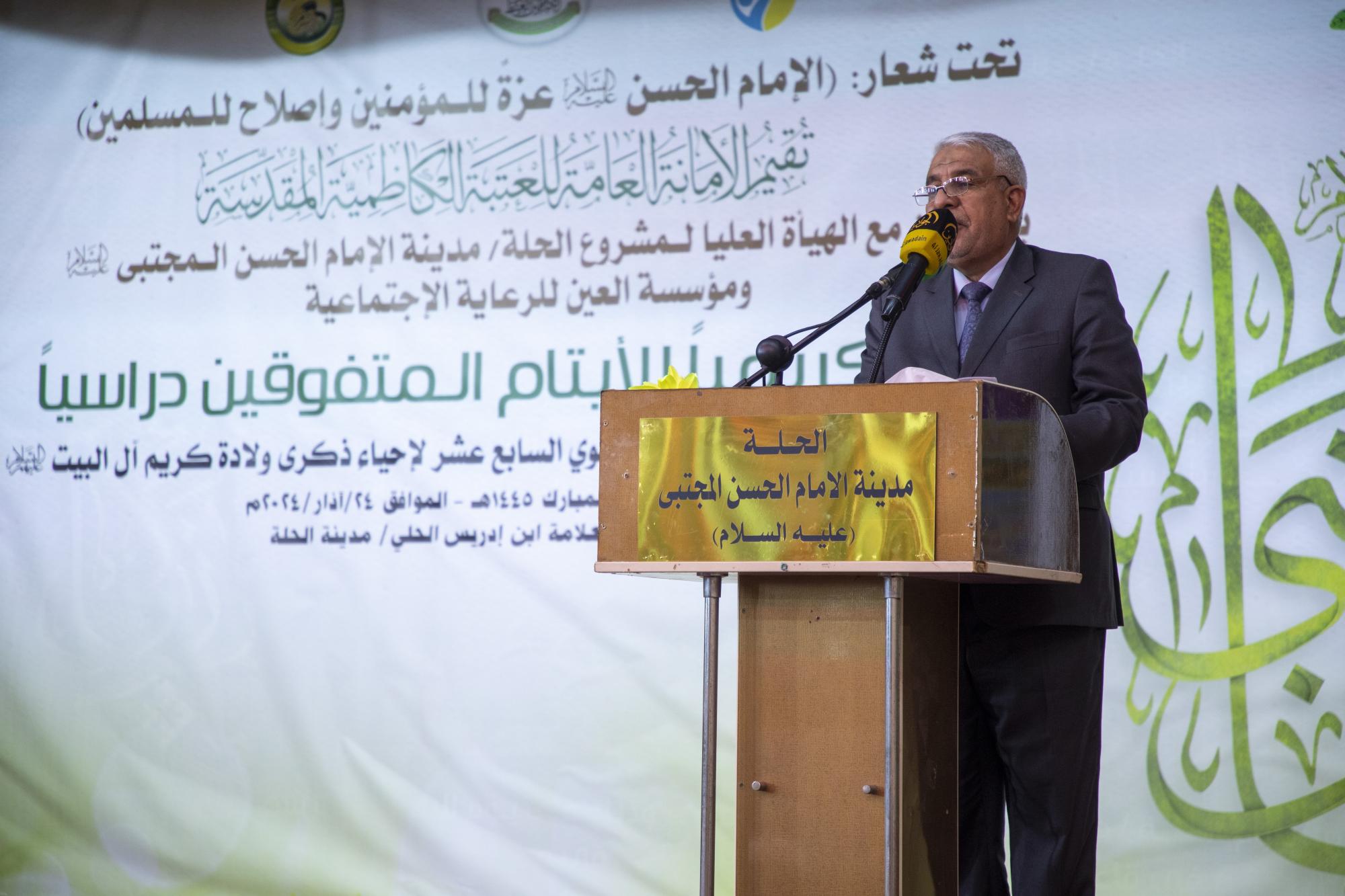Der Leiter der Obersten Kommission für das Hilla-Projekt, der Stadt von Imam Al-Hassan Al-Mujtaba (Friede mit ihm), Ingenieur Hassan Ali al-Hilli, sagte seinerseits: "Die Ehrung in dieser Sitzung des Festivals umfasste 100 Waisenkinder, die sich akademisch hervorgetan haben, und dies ist eine jährliche Tradition, um sie in Zusammenarbeit zwischen dem Heiligen Kadhemitischen Schrein und der Al-Ain-Stiftung für soziale Wohlfahrt zu ehren." ".