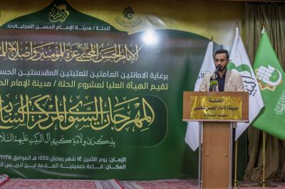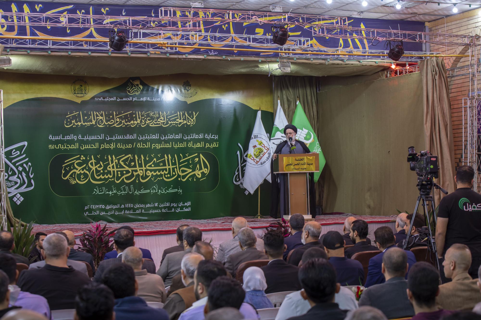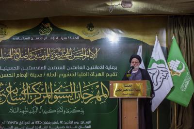 Elle a été suivie d'un discours devant la population du gouvernorat, prononcé par le président de l'Université de Babylone, le Dr Qahtan al-Jubouri, dans lequel il a évoqué la vie de l'Imam al-Mujtaba (que la paix soit sur lui), comment il a vaincu son père (que la paix soit sur lui) et son rôle dans l'effusion du sang des musulmans en renonçant à son droit au califat, indiquant que l'approche de l'Imam Hassan (que la paix soit sur lui) était un moyen de victoire pour la renaissance de Imam Hussein (que la paix soit sur lui).