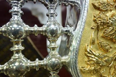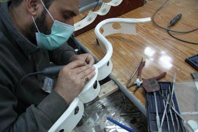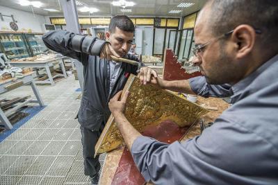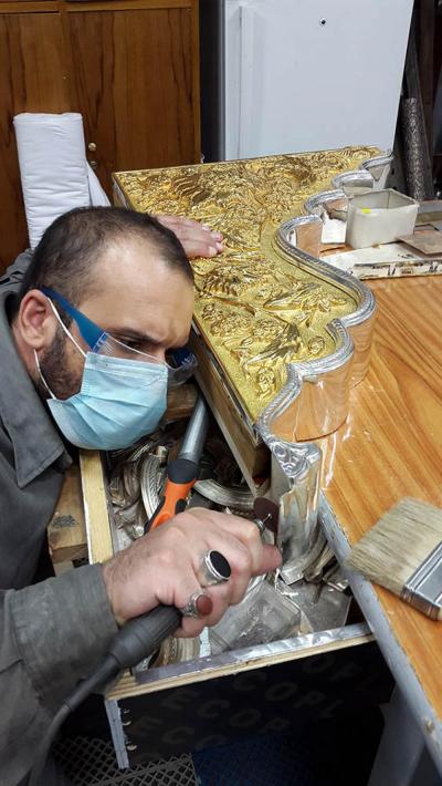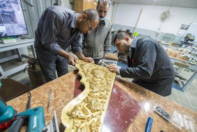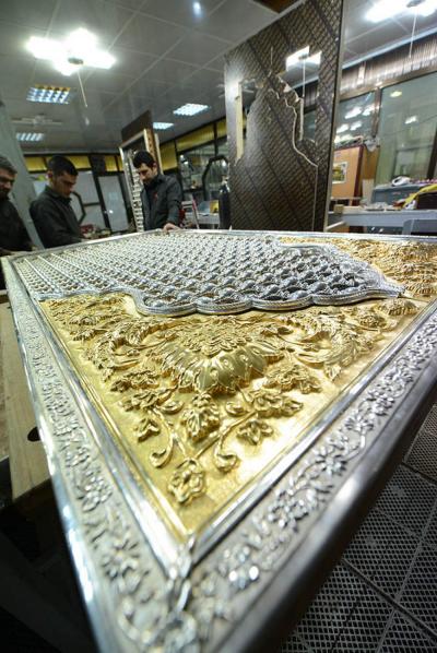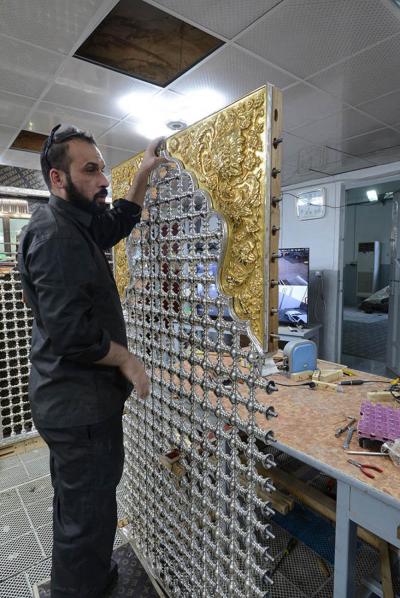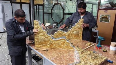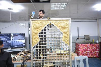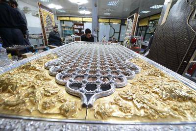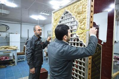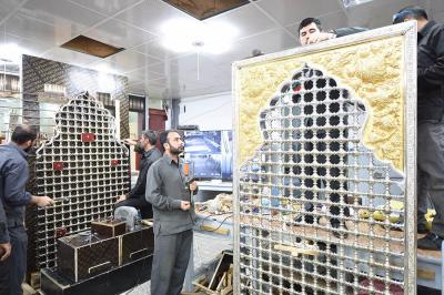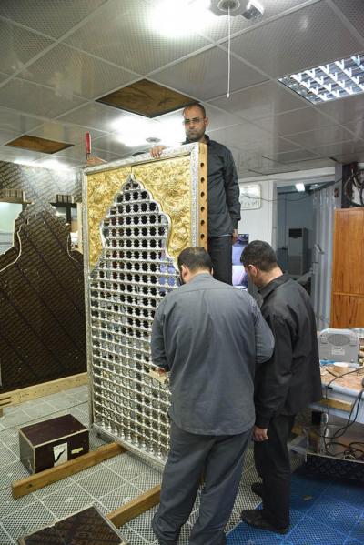 في سعيِها الدؤوبِ لإتمامِ الأعمالِ المناطةِ بها، ومن أجل إظهار الصورة الناصعة فنياً وهندسياً حتى تكتحل به عيونُ الزائرِين التائقة لمعانقةِ الأمل والبهجة النورانية التي تحوم على مرقدِ أبي الفضل العباس(عليه السلام)، وفي محاولةٍ لإثبات كفاءة وقدرات الطاقات الفنية العراقية وبيان مقدرتها على إدارة وتخطيط وتصميم المشاريع التي أشاد بها كلُّ مَنْ مرَّ بها، حيث تُواصل الكوادر العاملة في مصنع شبابيك الأضرحة التابع للعتبة العباسية المقدسة، وضمن مراحل صناعة شباك ضريح أبي الفضل العباس(عليه السلام) أعمالها الخاصة به، ومن تلكم المراحل التي تمّ الانتهاء منها مؤخّراً مرحلة تجميع وتركيب كافة أجزاء المثلث الذهبيّ وذلك تمهيداً لتركيبة على قطع المشبّكات (الدهنات) ليتمّ تركيبه على الهيكل الخشبيّ للشباك.