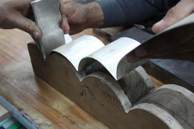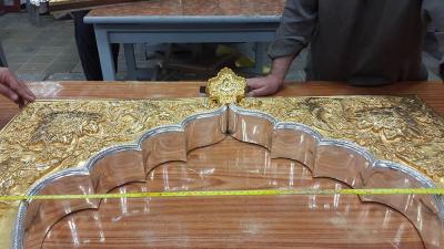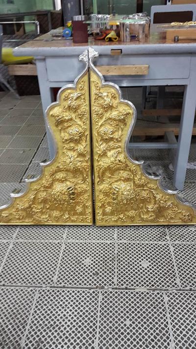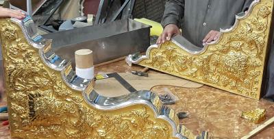فبعد أنْ تمّ الانتهاء من كافة أعمال تصنيع المثلثات الذهبية بوشر بمرحلة ربط أجزائها الأخرى، حيث تتمّ تهيئة الجانبين الأيسر والأيمن للوجه الأمامي للمثلث، لغرض البدء بعمليات ربطهما مع بعضهما لتربط مع الإطارات الخشبية المغلّفة بإطاراتٍ أخرى من الفضة هي على شكل مقوّسات بطول (130سم) وسُمْك (1,5ملم) وعددها (28) إطاراً وتشمل أعمالاً منها الطوي واللحام والبرد والتنعيم والتبييض والتلميع لتُختَتَمَ بـ(التجفيت)، ويبلغ سُمْكُ الإطارات الحالية ضعف سمك الإطارات المقوّسة السابقة وبطريقةٍ تصنيعية فنية أكثر تطوّراً منها، وباستخدام الفضة النقية (999) المخلوطة مع الذهب الخالص بنسبة (2%) وتكون هذه الإطارات مبطّنة بإطارات من مادة (الستينلس ستيل).