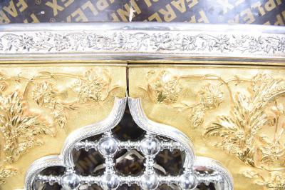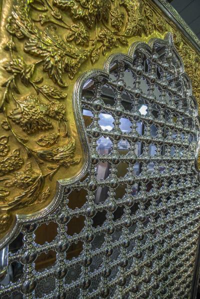 ومن الجدير بذكره أنّ المثلثات التي تمّ تصنيعها وتشكيلها تُشبه المثلّثات القديمة المركّبة على الشباك الحالي من حيث النقوش والزخارف النباتية، والتي تمّ نقشها وتطويع معدنها من قبل كادرٍ مختصٍّ في المصنع، وتحتاج هذه العملية دقّةً في تشكيلها كونها تُنفّذ يدوياً دون استخدام أيّ آلة، وهذا ما يتطلّب جهداً ووقتاً إضافيين، ويبلغ وزن المثلّث الواحد (5كغم) و(140كغم) للشباك كاملاً، وبسُمْك(1ملم)، واستُخدمت في صناعته مادةُ الذهب الخالص عيار (22 قيراط) ليكسبه رونقاً زاهياً ومقاومةً أكبر ضدّ الاسوداد، وليكون عمره أطول من خلال مقاومته التغيرات التي قد تحصل مستقبلاً.