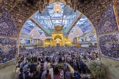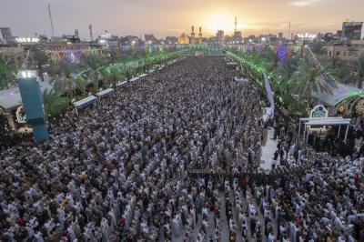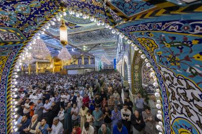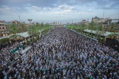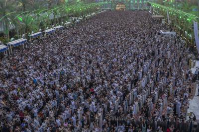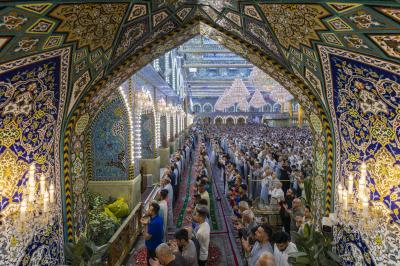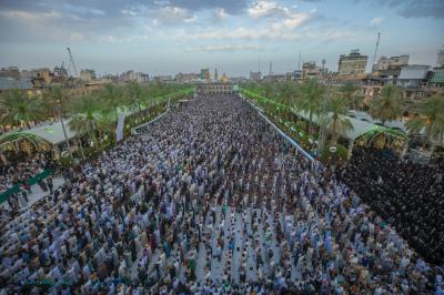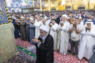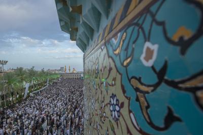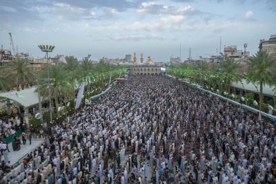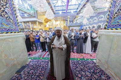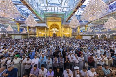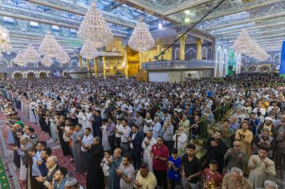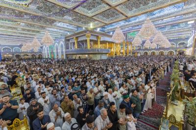 The prayer was held more than once in the form of groups in the courtyard of the shrine of Aba al-Fadl al-Abbas(peace be upon him), and in a way that does not affect the movement of visitors, because of the large number of arrivals to visit the holy shrine from inside and outside the province of Karbala.