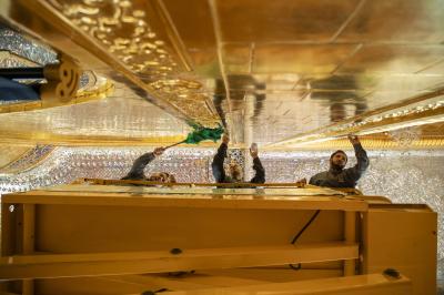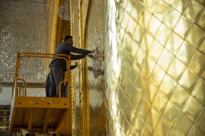 وتابع، أنّ الأعمال تشمل إيوان الحرم الطاهر ومقاطع الشباك كافة، التي تتميز بدقة زخارفها ونقوشها الفنية، باستخدام مواد خاصة لا تؤثر على بلاطات الذهب.