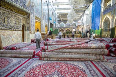 وأضاف أن "الأعمال شملت رفع السجّاد القديم ورزمه، وإجراء غسل شامل للمكان وفرش طقم السجّاد بحسب قياس كلّ مقطع في الحرم الطاهر وتعطيره وتبخيره".