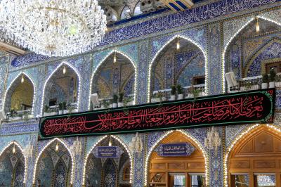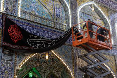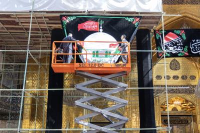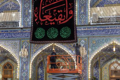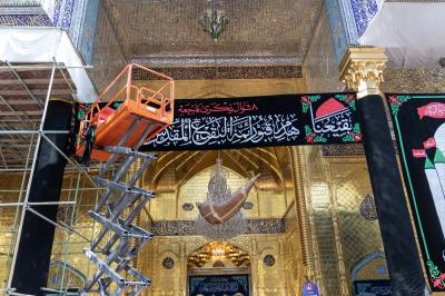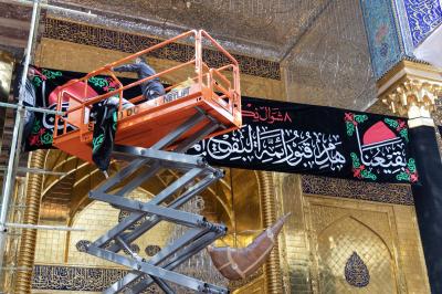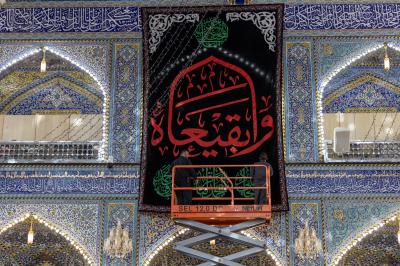 Die Mitarbeiter der Abteilung für heilige Pflege verbreiteten die Zeichen der Trauer im gesamten Schrein von Aba al-Fadl Al-Abbass (Friede mit ihm), indem sie Stücke und Kondolenzschilder aufhängten, die genäht, gestickt und geformt wurden, nachdem sie alle Maße für jeden Bereich des heiligen Hofes, von Wänden, Eingängen und Ausgängen genommen hatten.