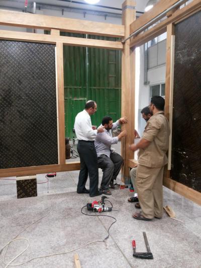 وأنيط شرفُ هذا العمل لقسم الصيانة الهندسية في العتبة العباسية المقدسة (شعبة النجارة)، والتي هي أوّل جهةٍ عراقيةٍ تقوم بتصنيع هيكلٍ خشبيّ لشباك أحد الأضرحة المقدّسة، والتي أخذت على عاتقها بالمرحلة الأولى ضبط القياسات المطلوبة التي هي طبق الأصل نفس قياسات الشبّاك القديم –الحالي-، لتأتي بعدها مرحلة احتساب كمية الأوزان من الذهب والفضة وقِطَعِها التي ستكسو هذا الهيكل، وبعد أخذ هذه القياسات والأوزان وإجراء دراسةٍ بهذا الخصوص تمّ اختيار نوعية الخشب وأطواله.