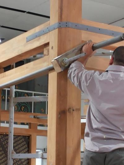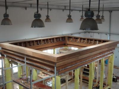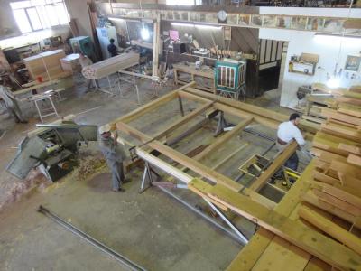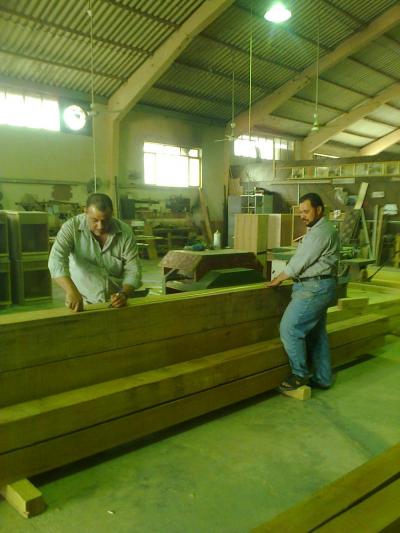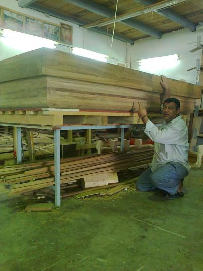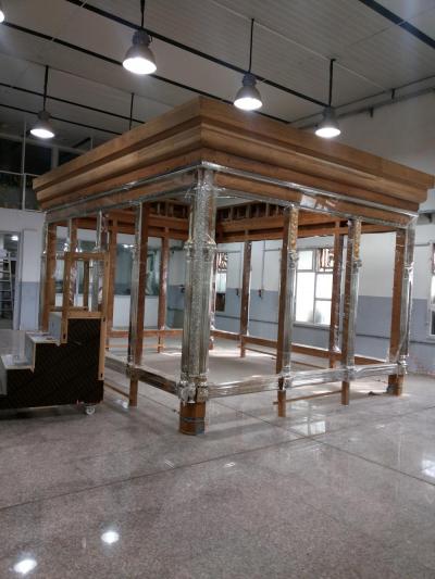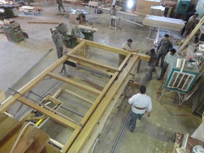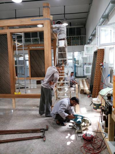 فكان الخشب المُستَخدَم هو خشب الصاج البورمي الذي تمّ استيراده من الهند، والذي يمتاز بعدّة ميزات منها مقاومته للظروف البيئية المختلفة من رطوبة وغيرها، ودرجة تحمّله العالية للأحمال والأثقال، وعدم تعرّض حشرة النمل الأبيض له "الأرضة" وغيرها، حيث تمّ تشكيل الخشب الخام وتقطيعه وفقاً لأبعاد الهيكل وباستخدام آلات ومكائن خاصة تمّت تهيئتها لهذا الغرض وبإشراف كادرٍ فنيّ، حيث تمّ تقطيعه وإجراء العمليات الفنّيّة والهندسية وفقاً للقياسات المطلوبة والتي كانت: