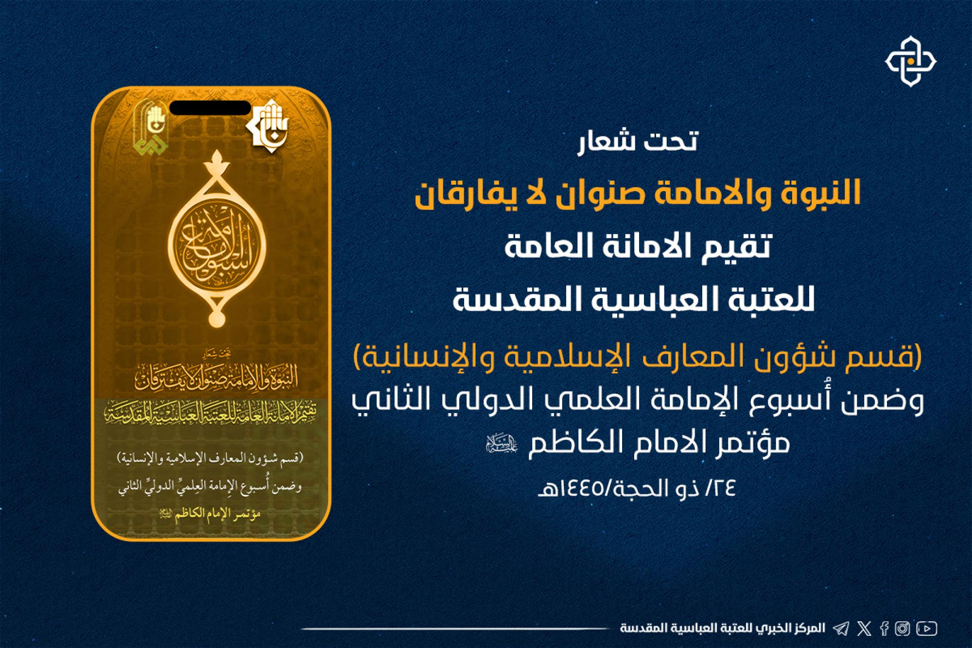 ويشرف على المؤتمر قسم شؤون المعارف الإسلامية والإنسانية، التابع للعتبة العبّاسية المقدّسة، ضمن فعّاليات أسبوع الإمامة العلمي الدوليّ الثاني، الذي يحمل شعار (النبوّة والإمامة صنوان لا يفترقان) وبعنوان (منهاج الأئمّة -عليهم السلام- في تربية الفرد والأمّة)، في يوم (24 ذي الحجّة/ 1445هـ) الموافق لـ(1 تموز/ 2024م) في العتبة المقدّسة.
