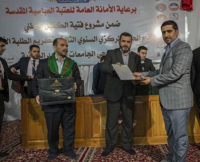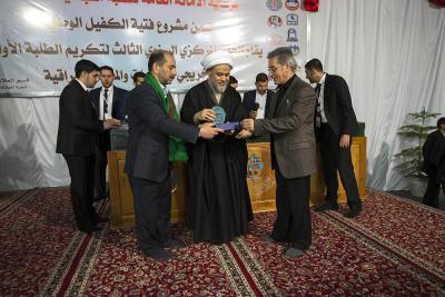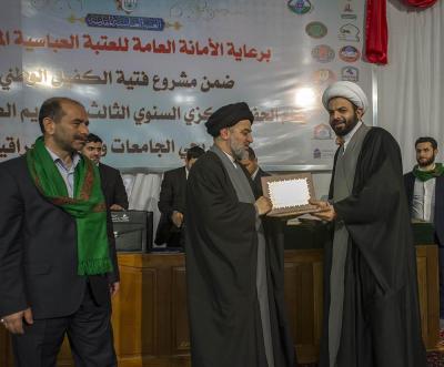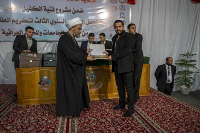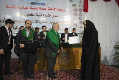 The Secretary-General of the Al-Abbas's (p) holy shrine, Sayed Ahmed Al-Safi has offered the shield of the holy shrine to the Iraqi universities and institutes, then the ceremony was concluded by the distribution of appreciation certificates and gifts by the Secretary-General of the Al-Abbas's (p) holy shrine, Sheikh Salah Al-Khafaji the head of religious affairs department, Sheikh Adil Al-Wakeel from the same department, Engineer Jaafar Mohamed board member of the holy shrine, Mr. Ali Kammoona the representative of United Nations in Iraq and some of the heads of departments of the holy shrine, to the 300 top students to encourage them to carry on their excellency for the service of this country. The honour ceremony also included those in charge of the project of Al-Kafeel Youth and its founders.
