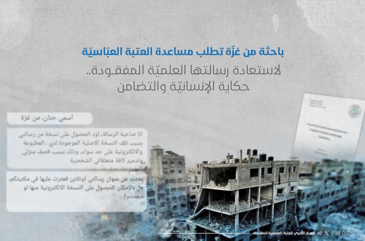 بعد أيَّام من بحث حنان المتواصل عَبرَ شبكة الإنترنت، ظهر بصيص أمل في أحد المواقع الإلكترونيّة التابعة للعتبة العبّاسيّة المقدّسة، حنان وجدت عنوان رسالتها محفوظًا في مكتبة العتبة المقدّسة ضمن مشروع مركز المعلومات الرقميّة التّابع لقسم الشؤون الفكريّة، والّذي يضمّ مئات الآلاف من المصادر العلميّة، فهل يمكن أن يكون هذا هو الخيط الذي يعيد لحنان جهد سنواتها الضائعة؟