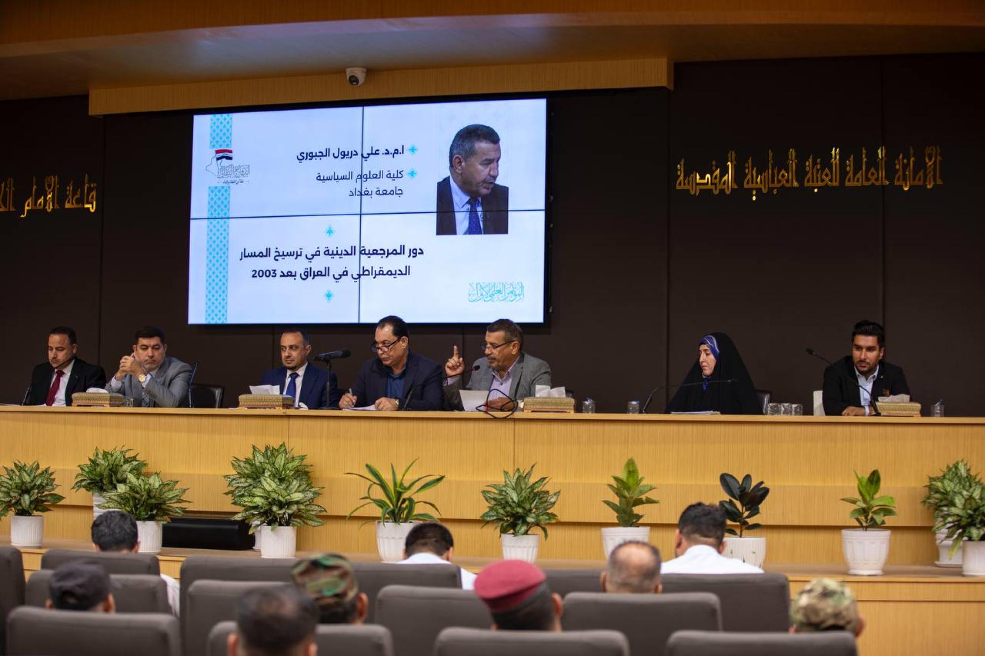 جاء ذلك خلال بحثه الموسوم (دور المرجعية الدينية في ترسيخ المسار الديمقراطي في العراق بعد عام 2003) الذي نوقش ضمن فعاليات الجلسة البحثية الثانية لليوم الثاني التي ترأسها الدكتور عباس هاشم لمحور (المرجعية الدينية والتحول الديمقراطي في العراق) من المؤتمر العلمي الأول حول فتوى الدفاع الكفائي، الذي تقيمه فرقة العباس (عليه السلام) بالتعاون مع كلية العلوم السياسية بجامعة بغداد، تحت شعار (الدفاع الكفائي عقد من العطاء والبناء)، في العتبة العباسية المقدسة.