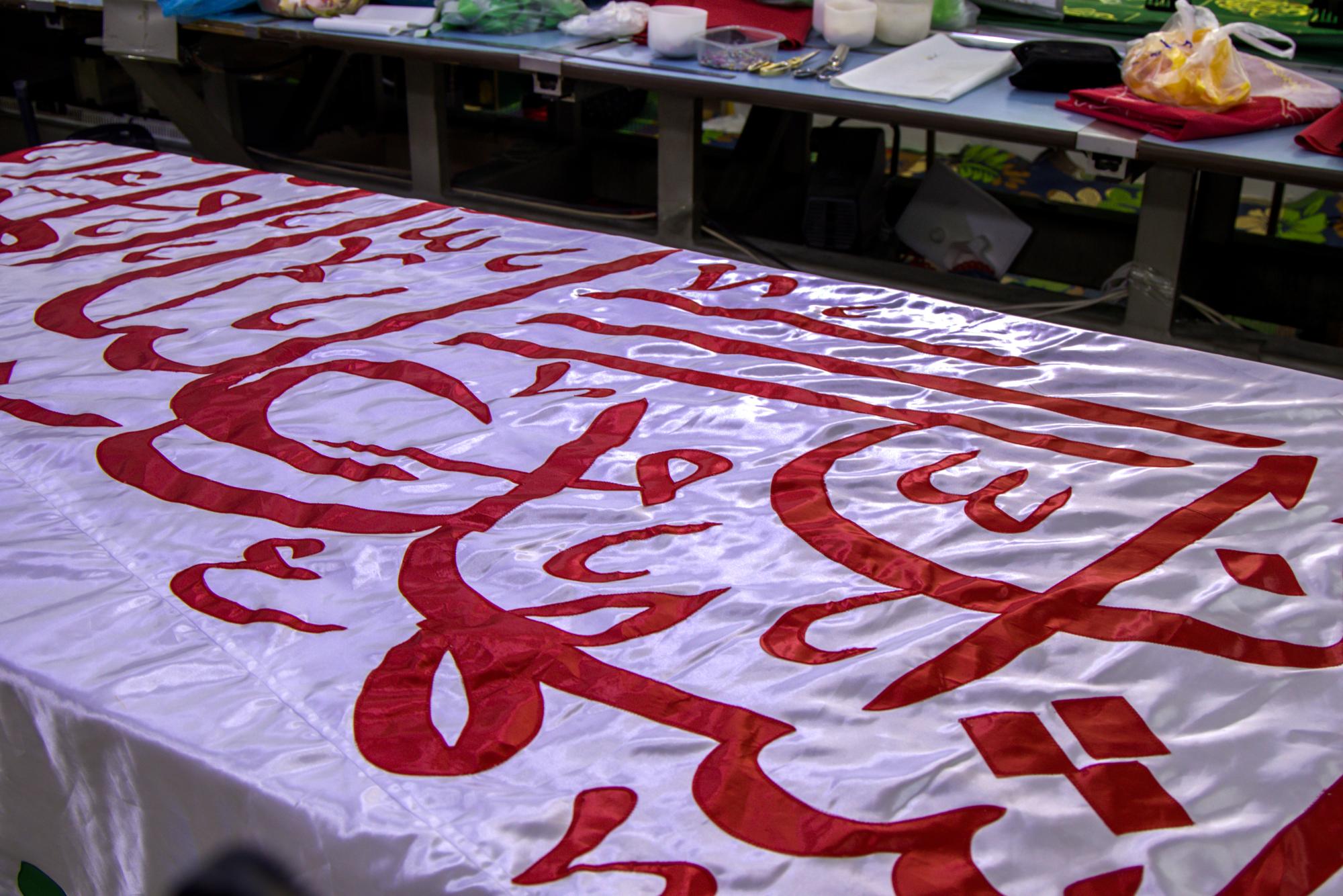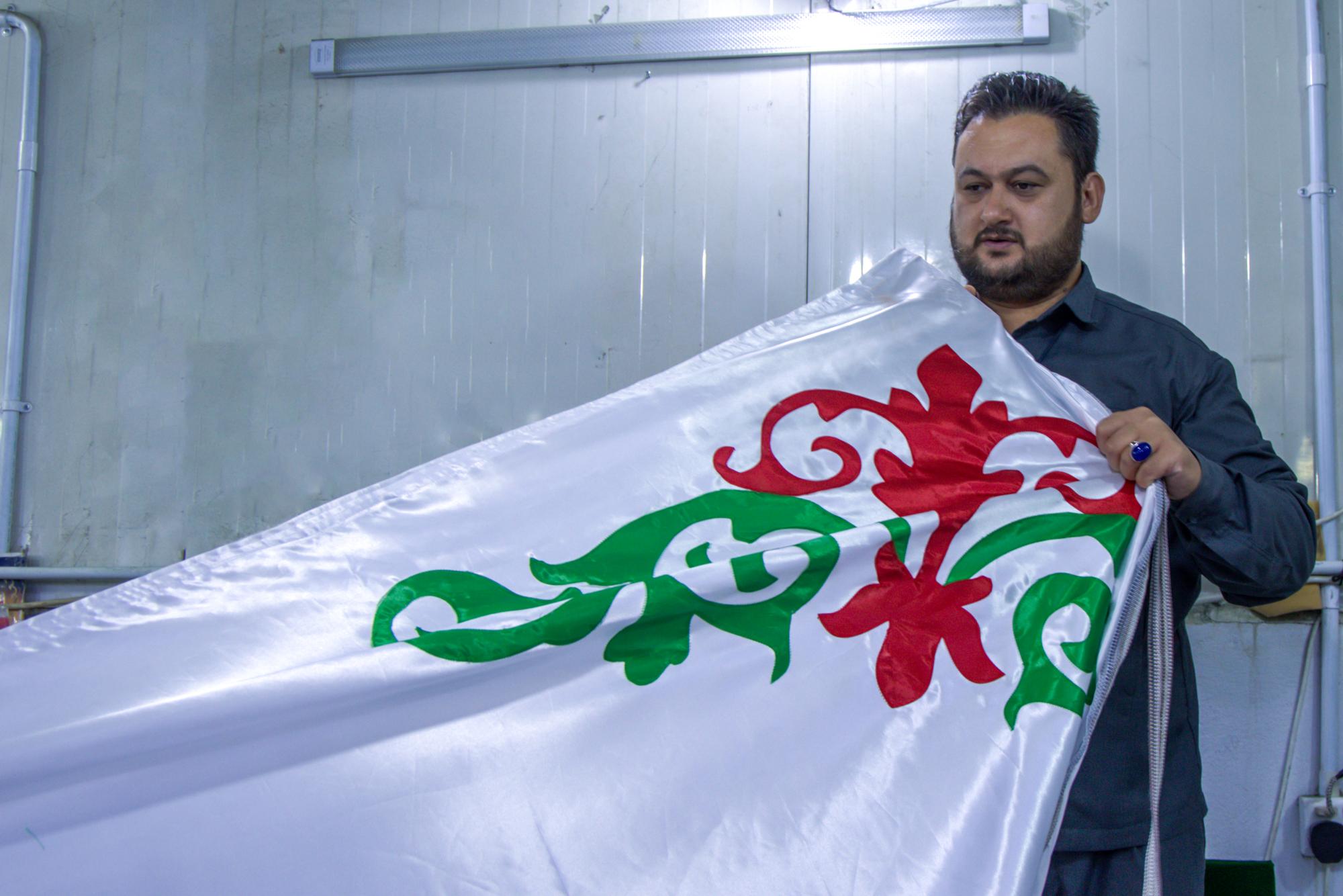 وأضاف أنّ "اللافتات استُخدمت في خياطتها تقنيات يدوية وميكانيكية؛ لتحقيق أعلى مستوى من الدقة والجودة في العمل الفني، وأنتجنا لافتات تميزت بالتصميم الجميل والألوان المميزة"، لافتًا إلى أنّ "جميع العاملين في الشعبة يمتلكون مهارات وحرفية عالية".