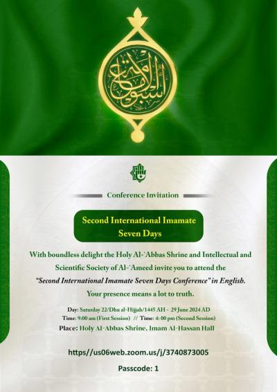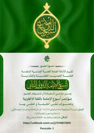 وتقيم العتبة العبّاسيّة أسبوع الإمامة العلميّ الدّولي الثّاني تحت شعار (النبوّة والإمامة صنوان لا يفترقان) وبعنوان (منهاج الأئمّة -عليهم السّلام- في تربية الفرد والأمّة)، للمدّة 27/6/2024م إلى 4/7/2024م.