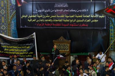 This condolences program started at the Al-'Alqami service complex of the Al-Abbas's (p) holy shrine, by the recitation of verses of the Holy Quran and the word of the Secretariat-General of the holy shrine delivered by the Deputy Secretary-General, Engineer Basheer Mohamed Jassem, in which he explained after presenting his condolences to the students for this sad anniversary: "The students have to be inspired in the this sad anniversary from the position, the patience and the steadfastness of the beloved daughter of the greatest man in the history, through the diligence in their studies in line with ethical, moral and educational aspects, with which they can face all obstacles in their life and can serve their country in all circumstances."
