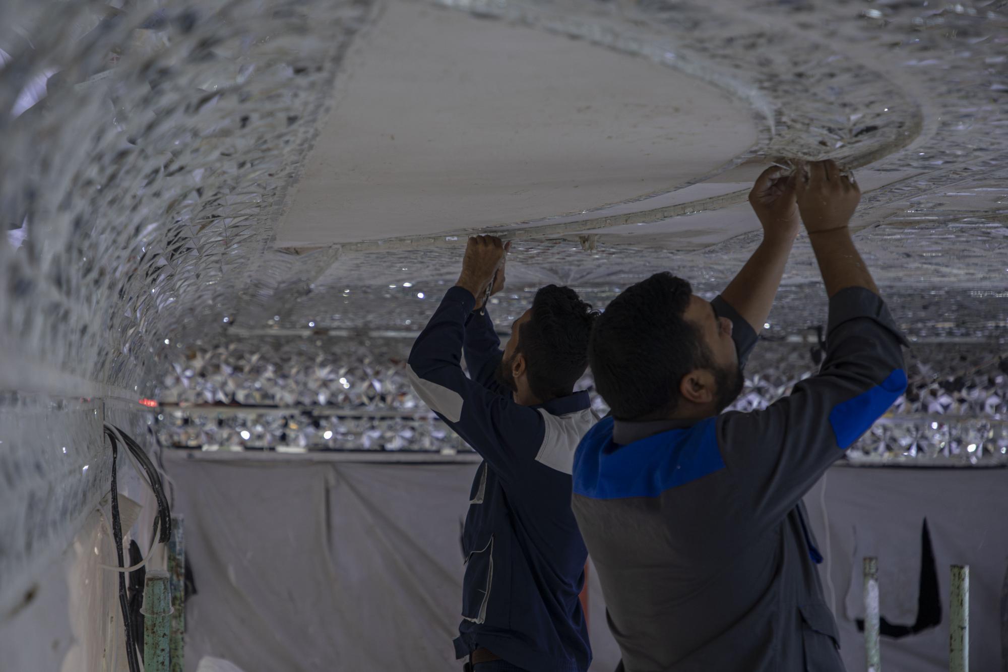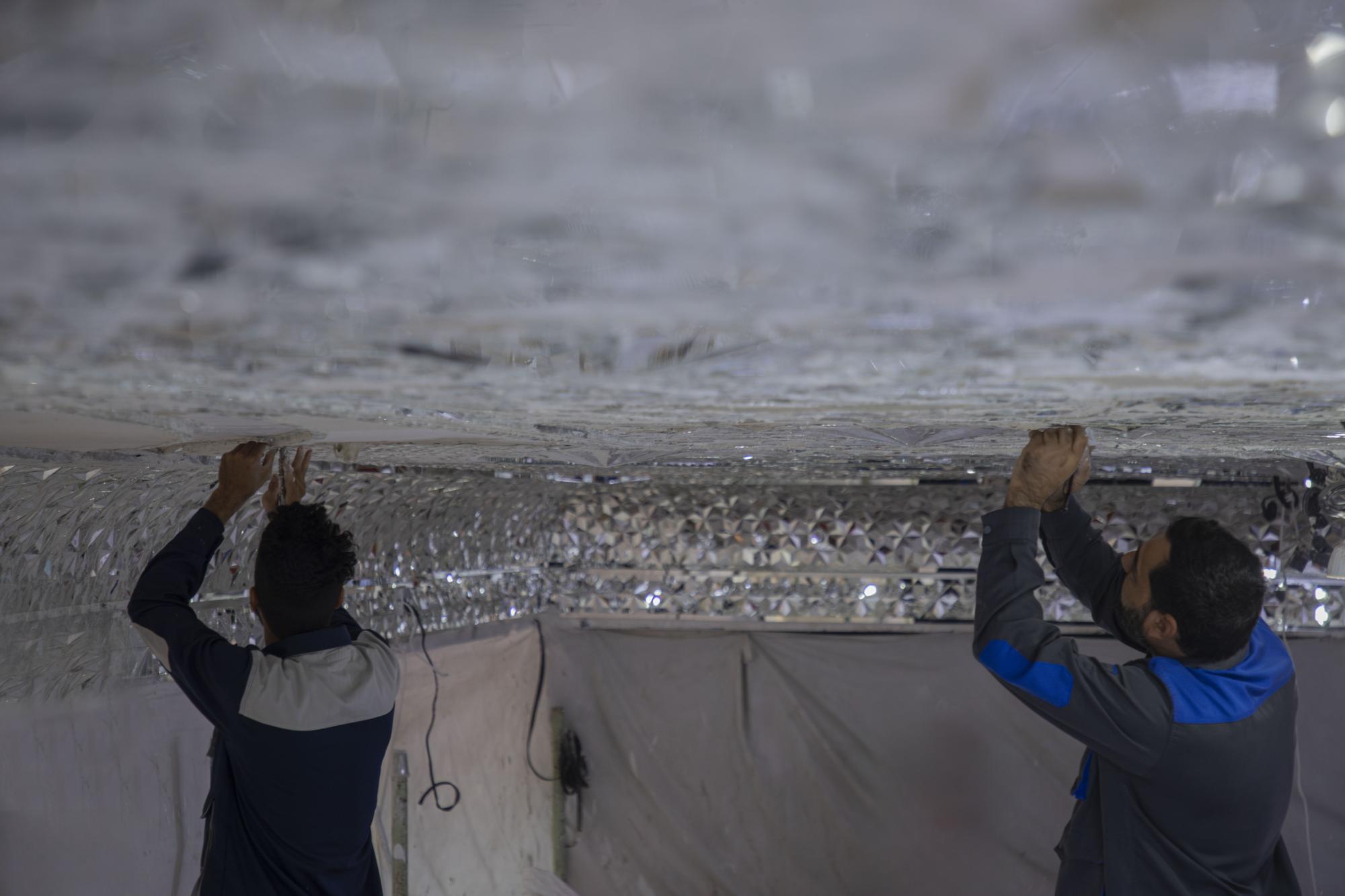 وأضاف، أنّ "مساحة الأعمال بلغت 180م2 وفق أشكال هندسية مطابقة للتصميم وبأياد عراقية، وباستخدام مرايا ذات كفاءة عالية ومن مناشئ عالمية".