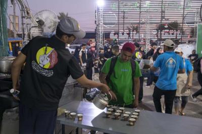 وتواصل مواكبها الليل بالنهار؛ لتقديم الخدمة للقادمين سيرًا على الأقدام نحو كربلاء المقدسة، عبر توزيع ثلاث وجبات رئيسة يوميًّا، بالإضافة إلى الوجبات البينية، وتوزيع المياه المبردة والعصائر، وفق مسؤول المجموعة السيد محمد حربي.