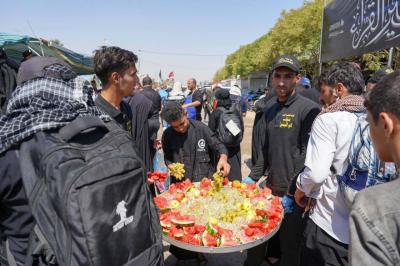 وأشار السيد ماجد الربيعي، مسؤول المواكب، إلى أنّ "المجموعة توفر وجبات طعام مقسمة على ثلاثة أوقات يوميًّا، بالإضافة إلى مشروبات ومثلجات، وأكثر من 500 كيلوغرام من الفواكه المتنوعة في اليوم.