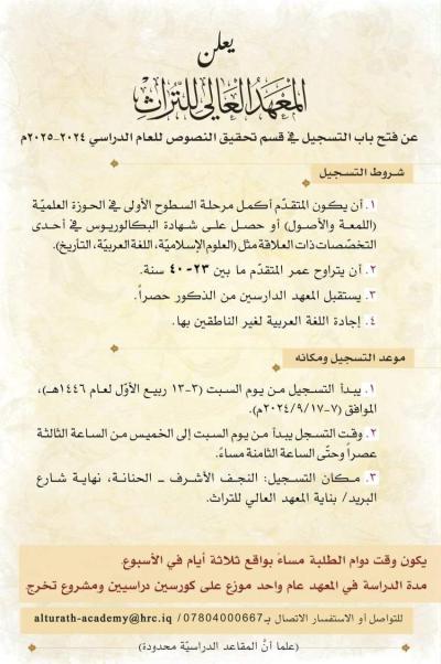 أعلنت الهيأة العليا لإحياء التراث في العتبة العباسية المقدسة، عن فتح باب التسجيل في المعهد العالي للتراث/ قسم تحقيق النصوص للعام 2024-2025 م.