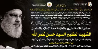 روضہ مبارک امام حسین(ع) اور روضہ مبارک حضرت عباس(ع) کے سیکرٹریٹ نے شہید علامہ حجۃ الاسلام و المسلمین سید حسن نصر اللہ اور لبنانی مزاحمت میں سے شہید ہونے والے ان کے بھائیوں اور درجہ شہادت پر فائز ہونے والے دسیوں نہتھے شہریوں کے ایصال ثواب اور انھیں خراج عقیدت پیش کرنے کے لیے مجلس ترحیم اور فاتحہ خوانی کا انعقاد کیا ہے۔