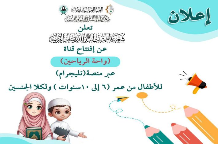 تستعد شعبة فاطمة بنت أسد للدراسات القرآنية في العتبة العباسية المقدسة لإطلاق قناة (واحة الرياحين) الإلكترونية للأطفال عبر تطبيق (تيليجرام).